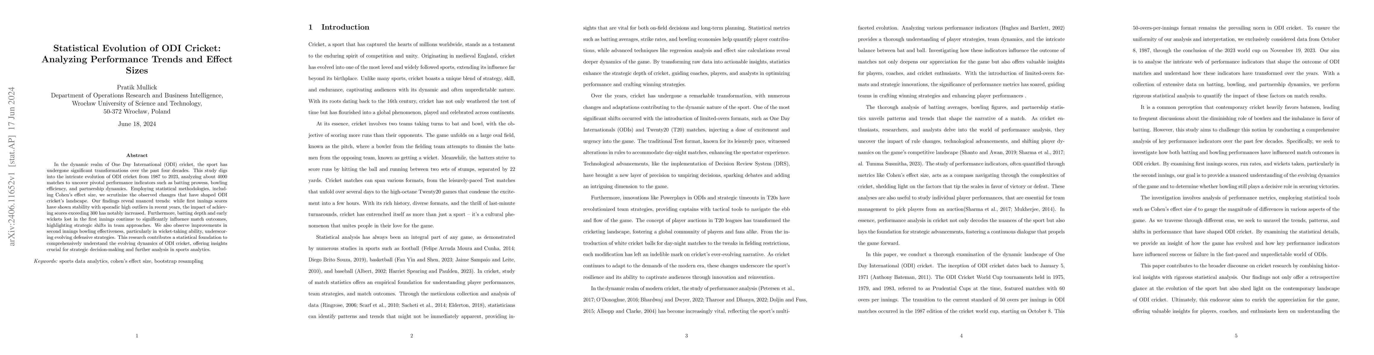 In the dynamic realm of One Day International (ODI) cricket, the sport has undergone significant transformations over the past four decades. This study digs into the intricate evolution of ODI cricket from 1987 to 2023, analyzing about 4000 matches to uncover pivotal performance indicators such as batting prowess, bowling efficiency, and partnership dynamics. Employing statistical methodologies, including Cohen's effect size, we scrutinize the observed changes that have shaped ODI cricket's landscape. Our findings reveal nuanced trends: while first innings scores have shown stability with sporadic high outliers in recent years, the impact of achieving scores exceeding 300 has notably increased. Furthermore, batting depth and early wickets lost in the first innings continue to significantly influence match outcomes, highlighting strategic shifts in team approaches. We also observe improvements in second innings bowling effectiveness, particularly in wicket-taking ability, underscoring evolving defensive strategies. This research contributes a statistical foundation to comprehensively understand the evolving dynamics of ODI cricket, offering insights crucial for strategic decision-making and further analysis in sports analytics.