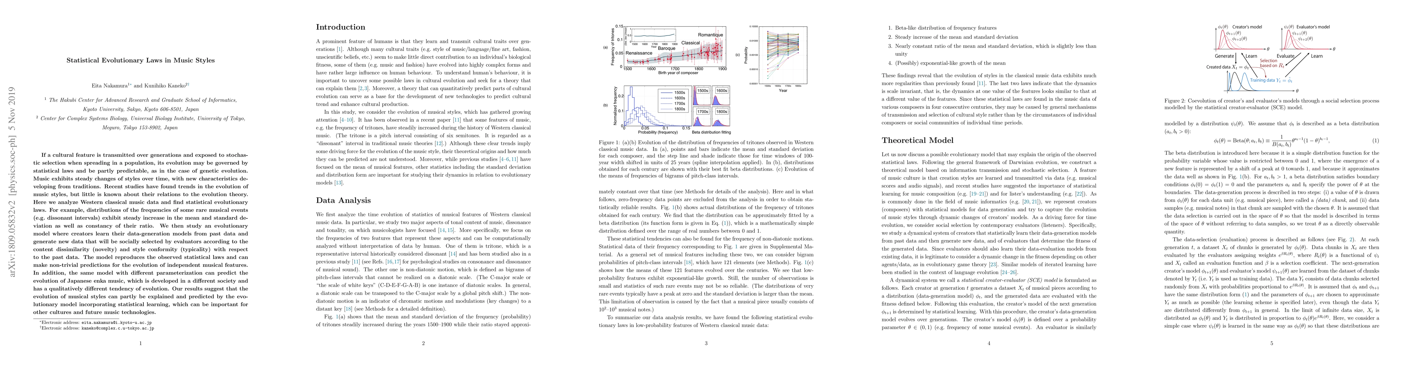This research identifies statistical evolutionary laws governing the development of Western classical music styles, demonstrating trends in the evolution similar to genetic evolution. An evolutionary model incorporating statistical learning and social selection can predict the evolution of musical features and is applicable to different cultures, such as Japanese enka music, suggesting a universal mechanism for music style evolution.