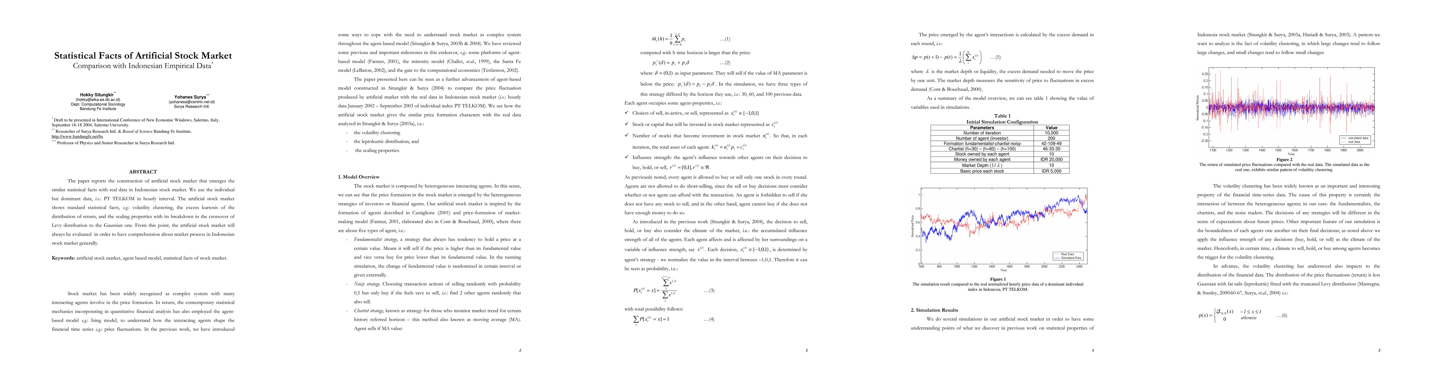 The paper reports the construction of artificial stock market that emerges the similar statistical facts with real data in Indonesian stock market. We use the individual but dominant data, i.e.: PT TELKOM in hourly interval. The artificial stock market shows standard statistical facts, e.g.: volatility clustering, the excess kurtosis of the distribution of return, and the scaling properties with its breakdown in the crossover of Levy distribution to the Gaussian one. From this point, the artificial stock market will always be evaluated in order to have comprehension about market process in Indonesian stock market generally.