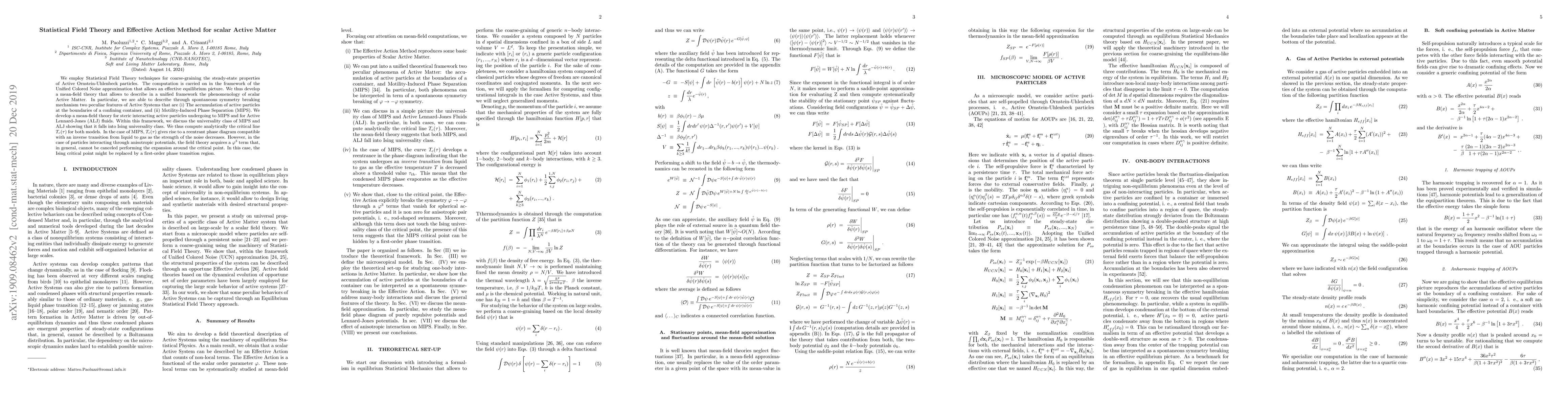 We employ Statistical Field Theory techniques for coarse-graining the steady-state properties of Active Ornstein-Uhlenbeck particles. The computation is carried on in the framework of the Unified Colored Noise approximation that allows an effective equilibrium picture. We thus develop a mean-field theory that allows to describe in a unified framework the phenomenology of scalar Active Matter. In particular, we are able to describe through spontaneous symmetry breaking mechanism two peculiar features of Active Systems that are (i) The accumulation of active particles at the boundaries of a confining container, and (ii) Motility-Induced Phase Separation (MIPS). \textcolor{black}{We develop a mean-field theory for steric interacting active particles undergoing to MIPS and for Active Lennard-Jones (ALJ) fluids.} \textcolor{black}{Within this framework}, we discuss the universality class of MIPS and ALJ \textcolor{black}{showing that it falls into Ising universality class.} We \textcolor{black}{thus} compute analytically the critical line $T_c(\tau)$ for both models. In the case of MIPS, $T_c(\tau)$ gives rise to a reentrant phase diagram compatible with an inverse transition from liquid to gas as the strength of the noise decreases. \textcolor{black}{However, in the case of particles interacting through anisotropic potentials, } the field theory acquires a $\varphi^3$ term that, \textcolor{black}{in general, cannot be canceled performing the expansion around the critical point.} In this case, the \textcolor{black}{Ising} critical point might \textcolor{black}{be replaced} by a first-order phase transition \textcolor{black}{region}.