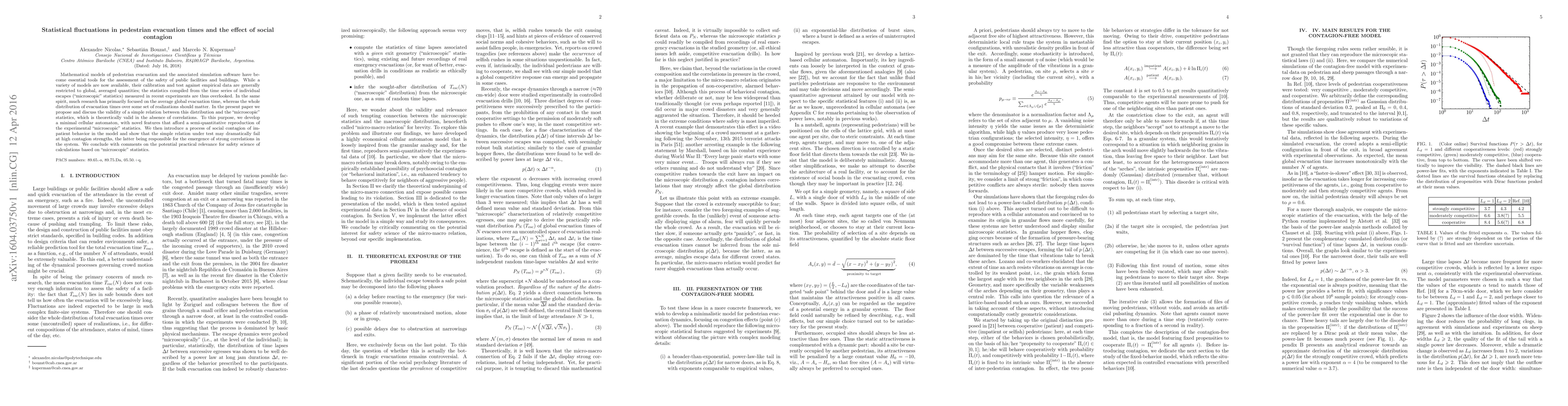 This paper develops a cellular automaton model to simulate pedestrian evacuation and examines statistical fluctuations in evacuation times. It finds that social contagion can significantly disrupt the expected distribution of evacuation times, highlighting the importance of considering "microscopic" statistics for safety assessments.