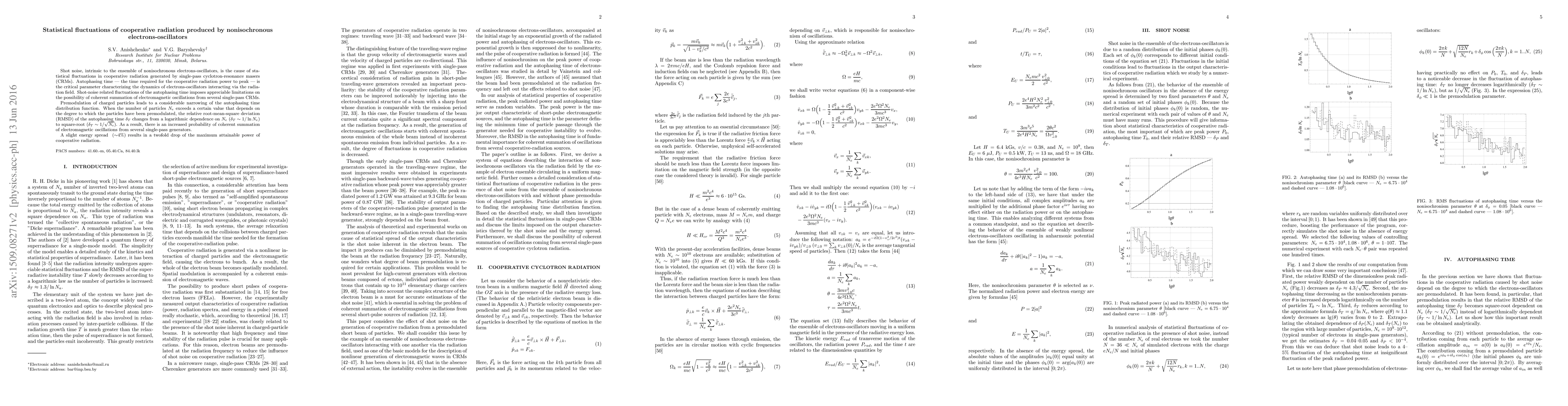 The paper explores statistical fluctuations in cooperative radiation from nonisochronous electron-oscillators in single-pass cyclotron-resonance masers (CRMs). Shot noise causes these fluctuations, affecting the autophasing time crucial for coherent radiation. Premodulation of charged particles reduces these fluctuations, enabling better coherent summation of EM oscillations from multiple CRMs. A small energy spread significantly decreases the maximum achievable radiation power.