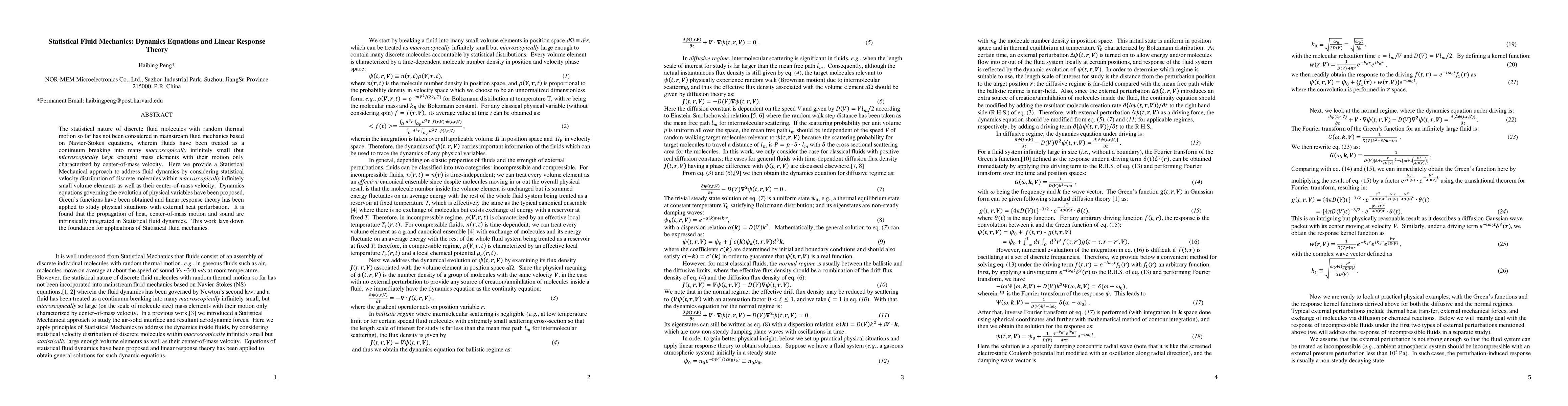 This paper introduces a Statistical Mechanical approach to fluid dynamics, considering both molecular velocity distributions and center-of-mass velocity. It proposes new dynamics equations, derives Green's functions, and applies linear response theory to study heat propagation and sound within fluids, integrating these phenomena into Statistical fluid mechanics.