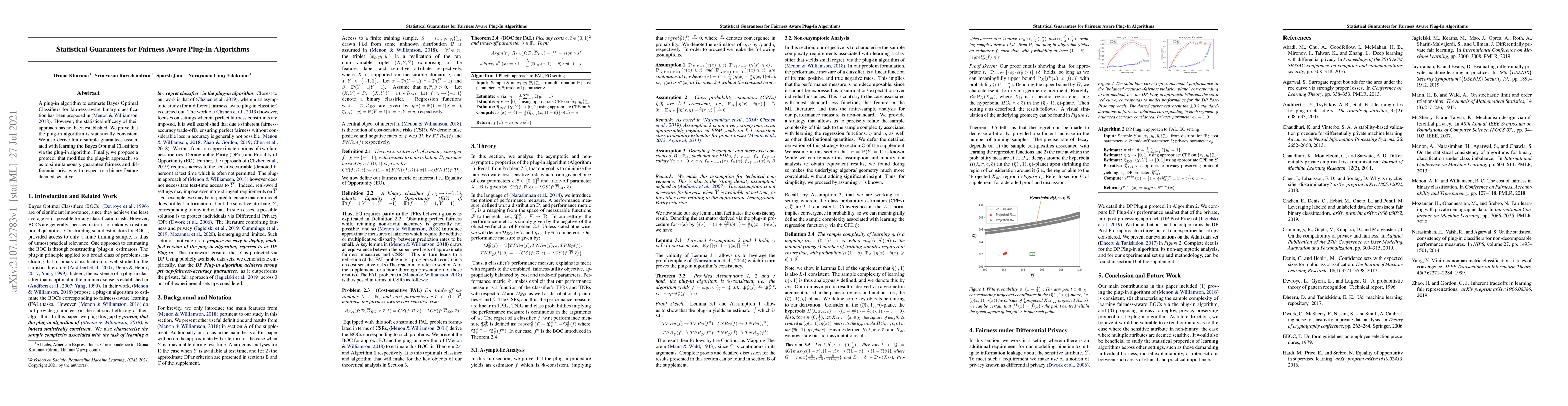 A plug-in algorithm to estimate Bayes Optimal Classifiers for fairness-aware binary classification has been proposed in (Menon & Williamson, 2018). However, the statistical efficacy of their approach has not been established. We prove that the plug-in algorithm is statistically consistent. We also derive finite sample guarantees associated with learning the Bayes Optimal Classifiers via the plug-in algorithm. Finally, we propose a protocol that modifies the plug-in approach, so as to simultaneously guarantee fairness and differential privacy with respect to a binary feature deemed sensitive.