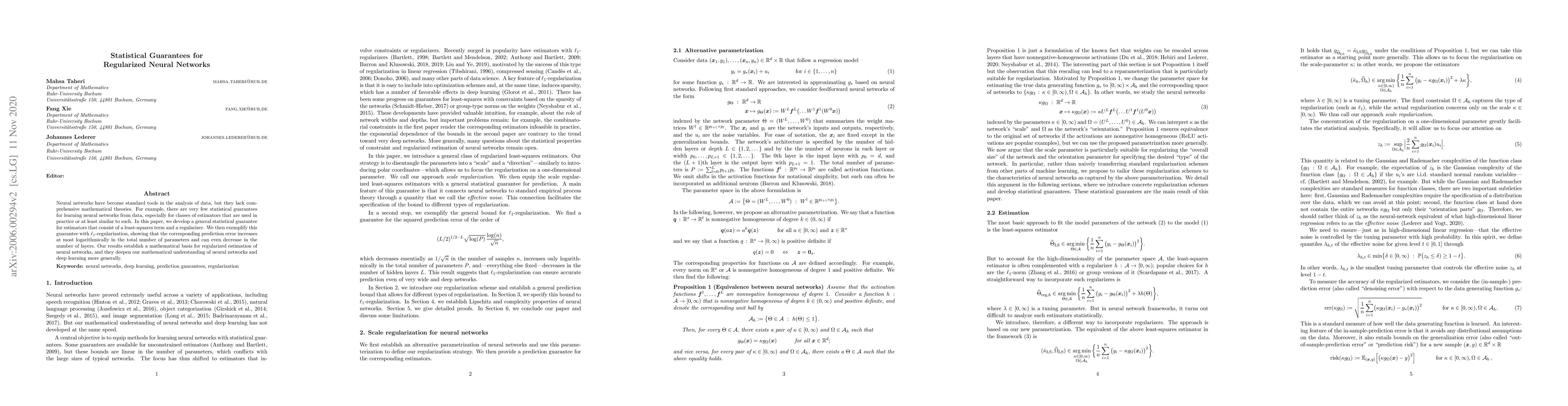 This paper develops statistical guarantees for regularized neural networks, focusing on estimators combining least-squares and regularization terms. It demonstrates that $\ell_1$-regularization leads to prediction errors that increase sub-linearly with the number of layers and logarithmically with the number of parameters, thereby establishing a mathematical foundation for neural network estimation.