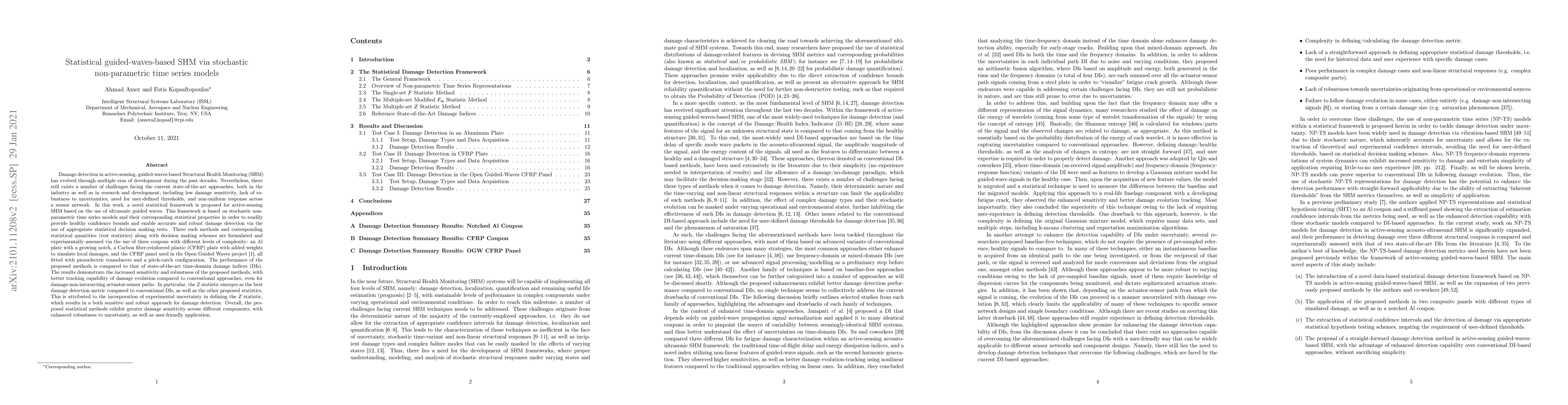 This paper proposes a novel statistical framework for guided-waves-based Structural Health Monitoring (SHM) using stochastic non-parametric time series models to enhance damage detection sensitivity and robustness. Experimental results show improved performance over state-of-the-art methods, demonstrating better tracking of damage evolution across different materials.