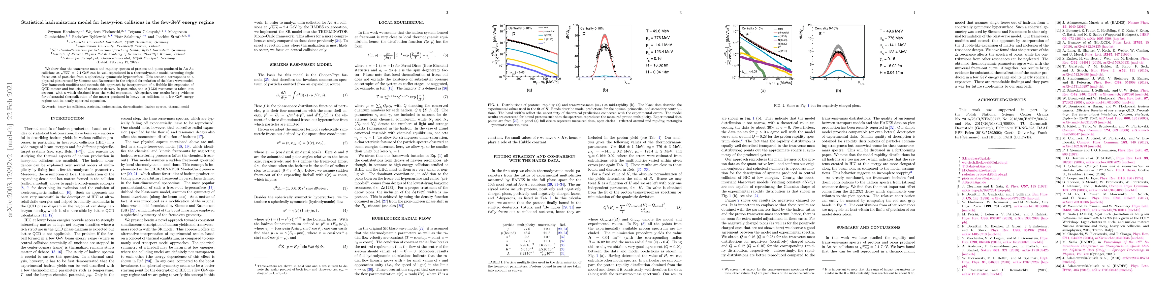 We show that the transverse-mass and rapidity spectra of protons and pions produced in Au-Au collisions at sqrt(sNN) = 2.4 GeV can be well reproduced in a thermodynamic model assuming single freeze-out of particles from a spherically symmetric hypersurface. This scenario corresponds to a physical picture used by Siemens and Rasmussen in the original formulation of the blast-wave model. Our framework modifies and extends this approach by incorporation of a Hubble-like expansion of QCD matter and inclusion of resonance decays. In particular, the Delta(1232) resonance is taken into account, with a width obtained from the virial expansion. Altogether, our results bring evidence for substantial thermalization of the matter produced in heavy-ion collisions in a few GeV energy regime and its nearly spherical expansion.