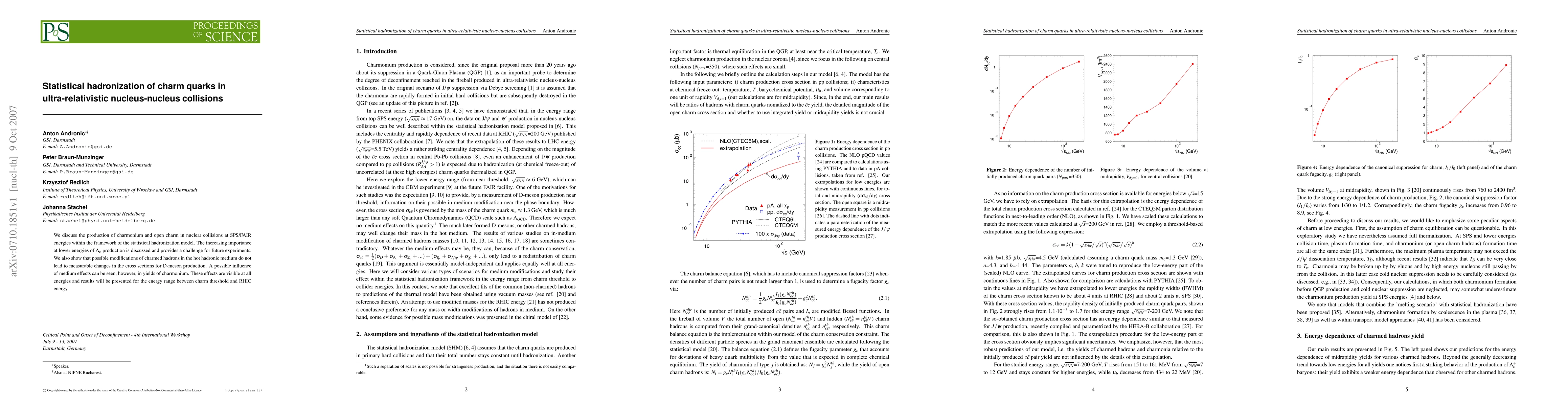 We discuss the production of charmonium and open charm in nuclear collisions at SPS/FAIR energies within the framework of the statistical hadronization model. The increasing importance at lower energies of Lambda_c production is discussed and provides a challenge for future experiments. We also show that possible modifications of charmed hadrons in the hot hadronic medium do not lead to measurable changes in the cross sections for D-meson production. A possible influence of medium effects can be seen, however, in yields of charmonium. These effects are visible at all energies and results will be presented for the energy range between charm threshold and RHIC energy.
