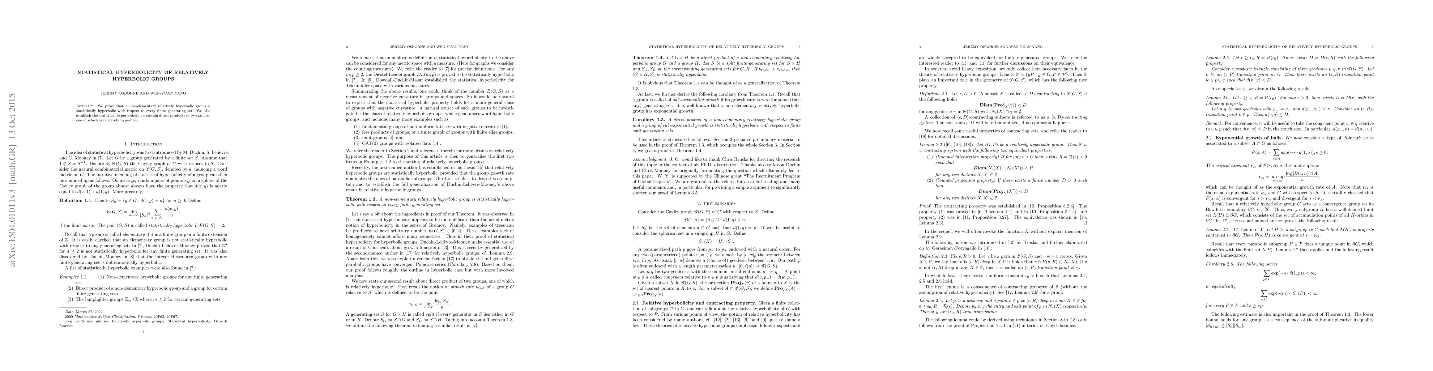 The paper introduces and applies advanced concepts from the theory of relatively hyperbolic groups, contracting systems, and Poincaré series to prove statistical hyperbolicity.