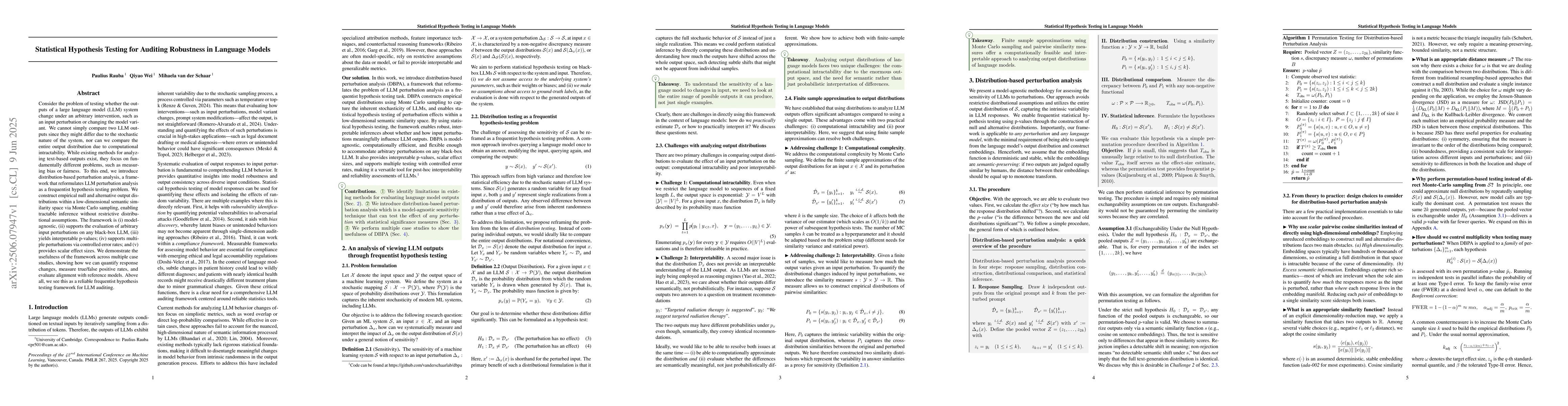 Consider the problem of testing whether the outputs of a large language model (LLM) system change under an arbitrary intervention, such as an input perturbation or changing the model variant. We cannot simply compare two LLM outputs since they might differ due to the stochastic nature of the system, nor can we compare the entire output distribution due to computational intractability. While existing methods for analyzing text-based outputs exist, they focus on fundamentally different problems, such as measuring bias or fairness. To this end, we introduce distribution-based perturbation analysis, a framework that reformulates LLM perturbation analysis as a frequentist hypothesis testing problem. We construct empirical null and alternative output distributions within a low-dimensional semantic similarity space via Monte Carlo sampling, enabling tractable inference without restrictive distributional assumptions. The framework is (i) model-agnostic, (ii) supports the evaluation of arbitrary input perturbations on any black-box LLM, (iii) yields interpretable p-values; (iv) supports multiple perturbations via controlled error rates; and (v) provides scalar effect sizes. We demonstrate the usefulness of the framework across multiple case studies, showing how we can quantify response changes, measure true/false positive rates, and evaluate alignment with reference models. Above all, we see this as a reliable frequentist hypothesis testing framework for LLM auditing.