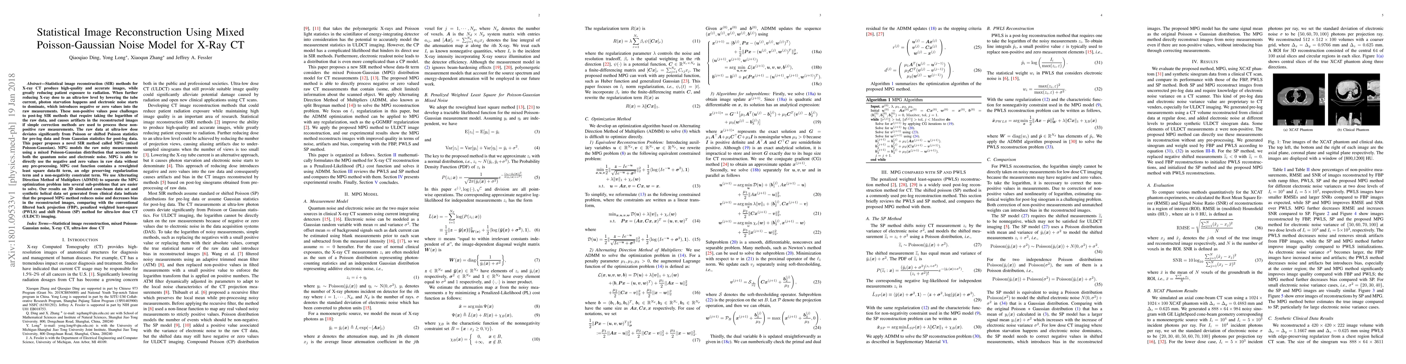 This paper introduces a novel statistical image reconstruction method called MPG (mixed Poisson-Gaussian) for ultra-low dose X-ray CT, which models raw measurements using a mixed Poisson-Gaussian distribution to account for both quantum and electronic noise. The MPG method effectively handles non-positive raw data values and reduces noise and bias in reconstructed images compared to conventional methods.
