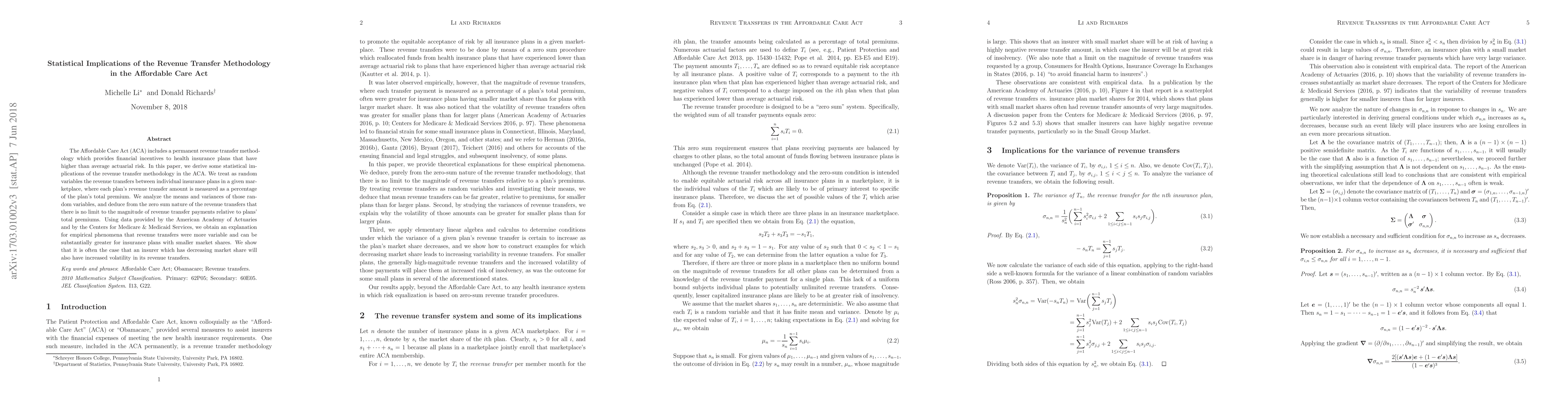 The Affordable Care Act (ACA) includes a permanent revenue transfer methodology which provides financial incentives to health insurance plans that have higher than average actuarial risk. In this paper, we derive some statistical implications of the revenue transfer methodology in the ACA. We treat as random variables the revenue transfers between individual insurance plans in a given marketplace, where each plan's revenue transfer amount is measured as a percentage of the plan's total premium. We analyze the means and variances of those random variables, and deduce from the zero sum nature of the revenue transfers that there is no limit to the magnitude of revenue transfer payments relative to plans' total premiums. Using data provided by the American Academy of Actuaries and by the Centers for Medicare and Medicaid Services, we obtain an explanation for empirical phenomena that revenue transfers were more variable and can be substantially greater for insurance plans with smaller market shares. We show that it is often the case that an insurer which has decreasing market share will also have increased volatility in its revenue transfers.