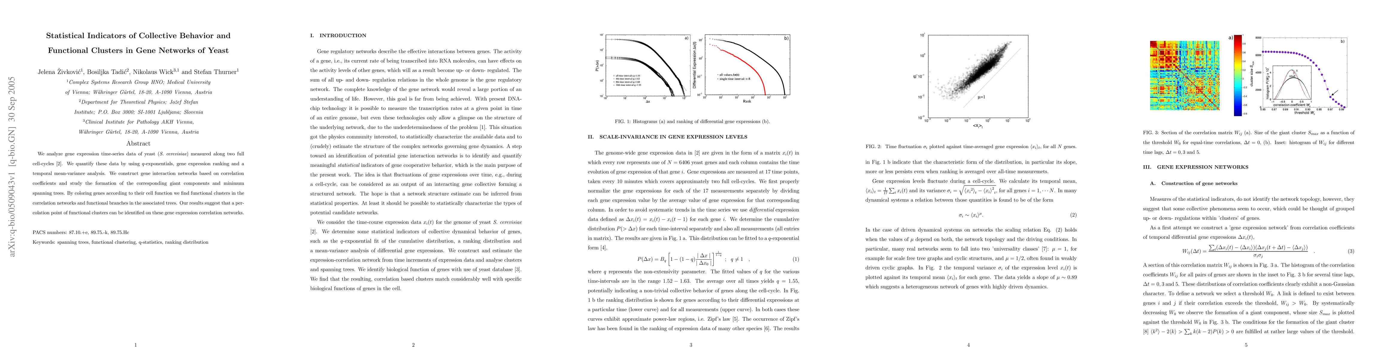 We analyze gene expression time-series data of yeast S. cerevisiae measured along two full cell-cycles. We quantify these data by using q-exponentials, gene expression ranking and a temporal mean-variance analysis. We construct gene interaction networks based on correlation coefficients and study the formation of the corresponding giant components and minimum spanning trees. By coloring genes according to their cell function we find functional clusters in the correlation networks and functional branches in the associated trees. Our results suggest that a percolation point of functional clusters can be identified on these gene expression correlation networks.