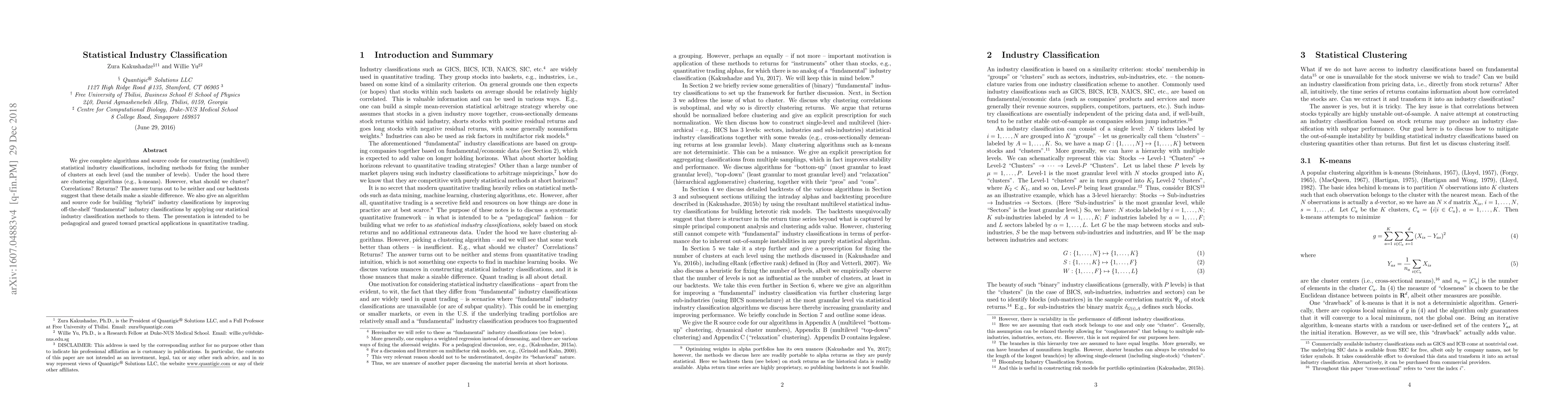 We give complete algorithms and source code for constructing (multilevel) statistical industry classifications, including methods for fixing the number of clusters at each level (and the number of levels). Under the hood there are clustering algorithms (e.g., k-means). However, what should we cluster? Correlations? Returns? The answer turns out to be neither and our backtests suggest that these details make a sizable difference. We also give an algorithm and source code for building "hybrid" industry classifications by improving off-the-shelf "fundamental" industry classifications by applying our statistical industry classification methods to them. The presentation is intended to be pedagogical and geared toward practical applications in quantitative trading.