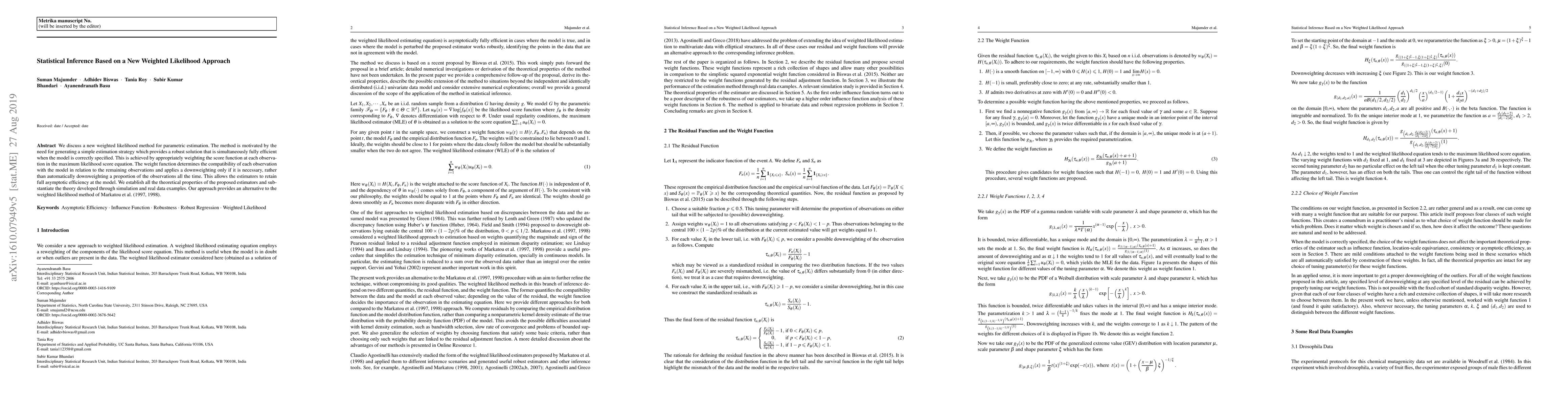 We discuss a new weighted likelihood method for parametric estimation. The method is motivated by the need for generating a simple estimation strategy which provides a robust solution that is simultaneously fully efficient when the model is correctly specified. This is achieved by appropriately weighting the score function at each observation in the maximum likelihood score equation. The weight function determines the compatibility of each observation with the model in relation to the remaining observations and applies a downweighting only if it is necessary, rather than automatically downweighting a proportion of the observations all the time. This allows the estimators to retain full asymptotic efficiency at the model. We establish all the theoretical properties of the proposed estimators and substantiate the theory developed through simulation and real data examples. Our approach provides an alternative to the weighted likelihood method of Markatou et al. (1997, 1998).