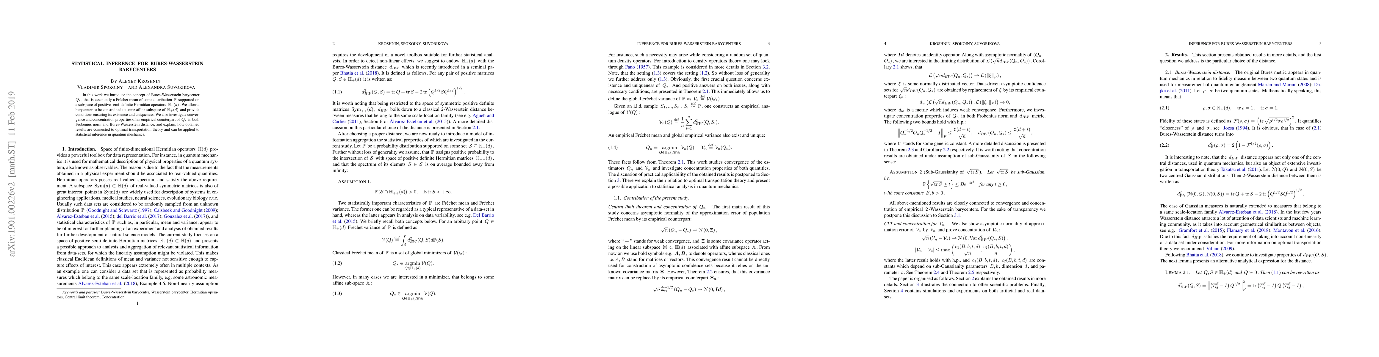 This paper introduces the Bures-Wasserstein barycenter $Q_*$, a Fr\'echet mean of distributions on positive semi-definite Hermitian operators, with conditions for its existence and uniqueness. It studies convergence and concentration properties of its empirical counterpart and connects the results to optimal transportation theory for applications in statistical inference in quantum mechanics.