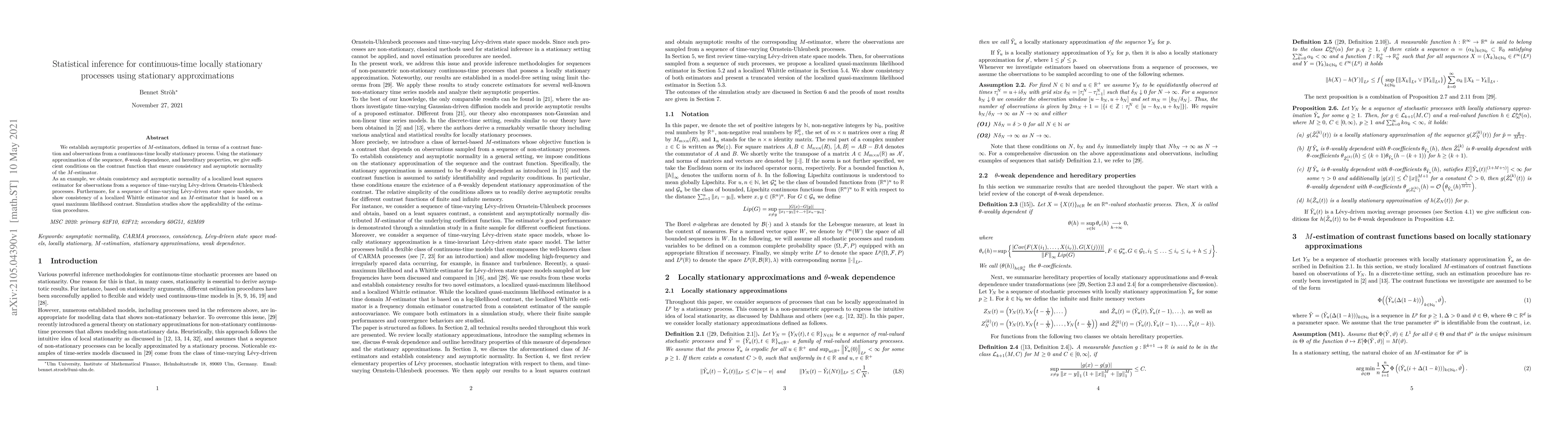 This research paper presents a method for statistical inference of continuous-time locally stationary processes, using stationary approximations. It establishes the consistency and asymptotic normality of $M$-estimators through $ heta$-weak dependence and hereditary properties. The study also demonstrates these principles with time-varying Lévy-driven Ornstein-Uhlenbeck processes and state space models, supported by simulation studies.