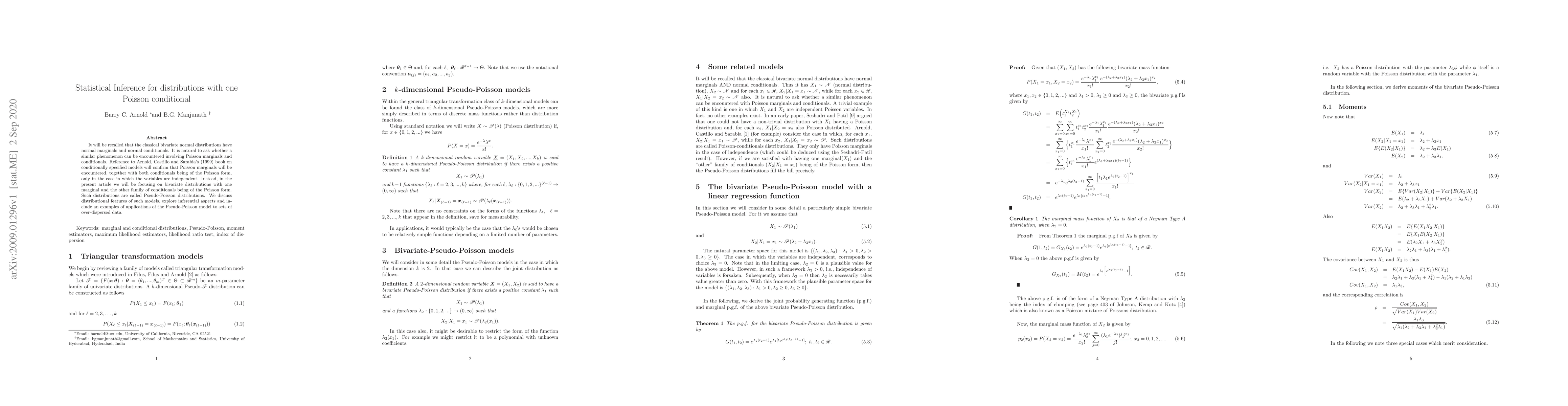 It will be recalled that the classical bivariate normal distributions have normal marginals and normal conditionals. It is natural to ask whether a similar phenomenon can be encountered involving Poisson marginals and conditionals. Reference to Arnold, Castillo and Sarabia's (1999) book on conditionally specified models will confirm that Poisson marginals will be encountered, together with both conditionals being of the Poisson form, only in the case in which the variables are independent. Instead, in the present article we will be focusing on bivariate distributions with one marginal and the other family of conditionals being of the Poisson form. Such distributions are called Pseudo-Poisson distributions. We discuss distributional features of such models, explore inferential aspects and include an example of applications of the Pseudo-Poisson model to sets of over-dispersed data.