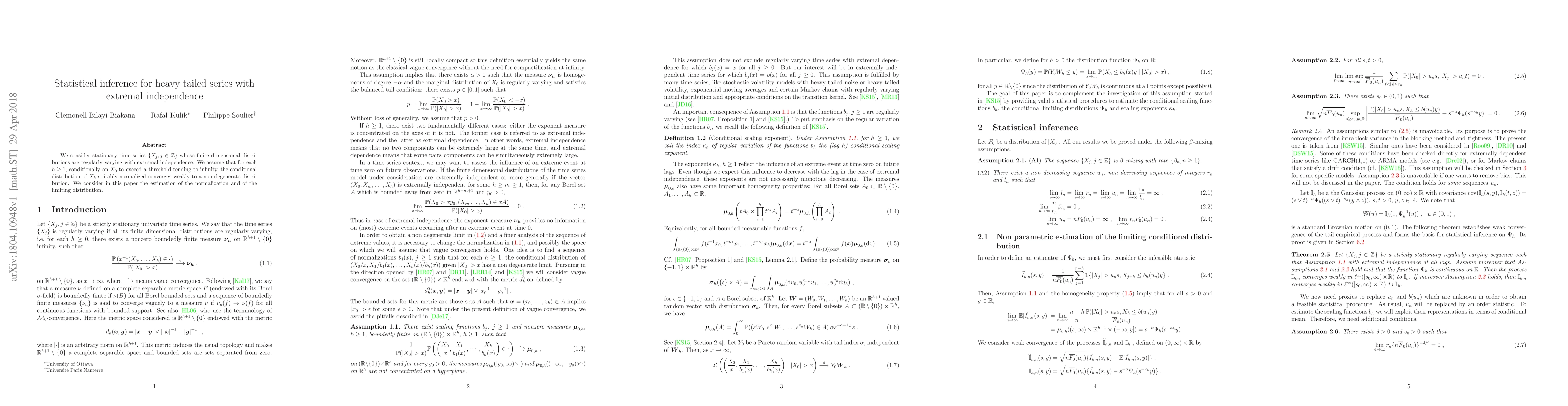 This paper investigates stationary time series with extremal independence and regularly varying distributions, focusing on the estimation of normalization and the limiting distribution when certain thresholds are exceeded. The study aims to provide statistical inference techniques for heavy-tailed series.