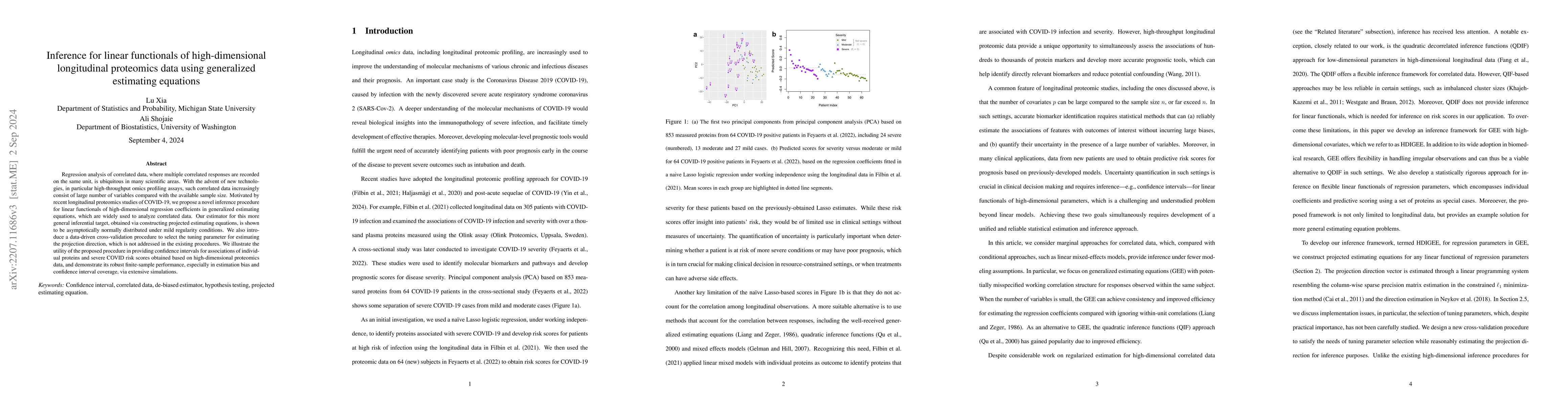 This paper proposes a new statistical inference method for high-dimensional generalized estimating equations (GEE) to analyze correlated data, focusing on linear combinations of regression coefficients. The method uses projected estimating equations and a data-driven cross-validation procedure for tuning parameter selection, demonstrating robust performance in simulations and application to a COVID-19 proteomic study.