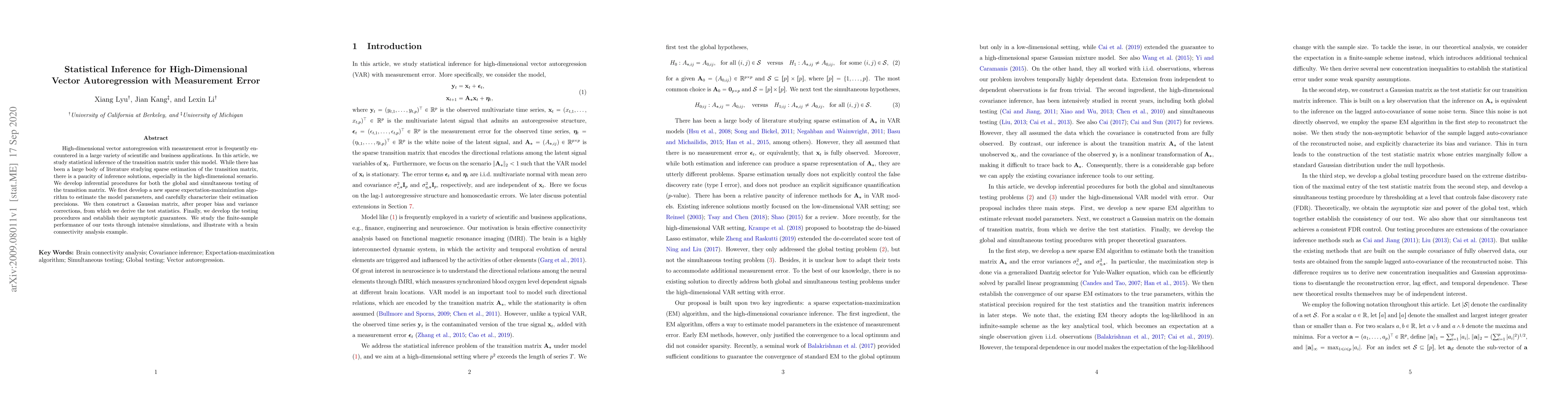 This paper develops inferential procedures for high-dimensional vector autoregression models with measurement error, focusing on the transition matrix. It introduces a sparse estimation algorithm and constructs a Gaussian matrix for test statistics, establishing asymptotic guarantees and demonstrating performance through simulations and a brain connectivity example.