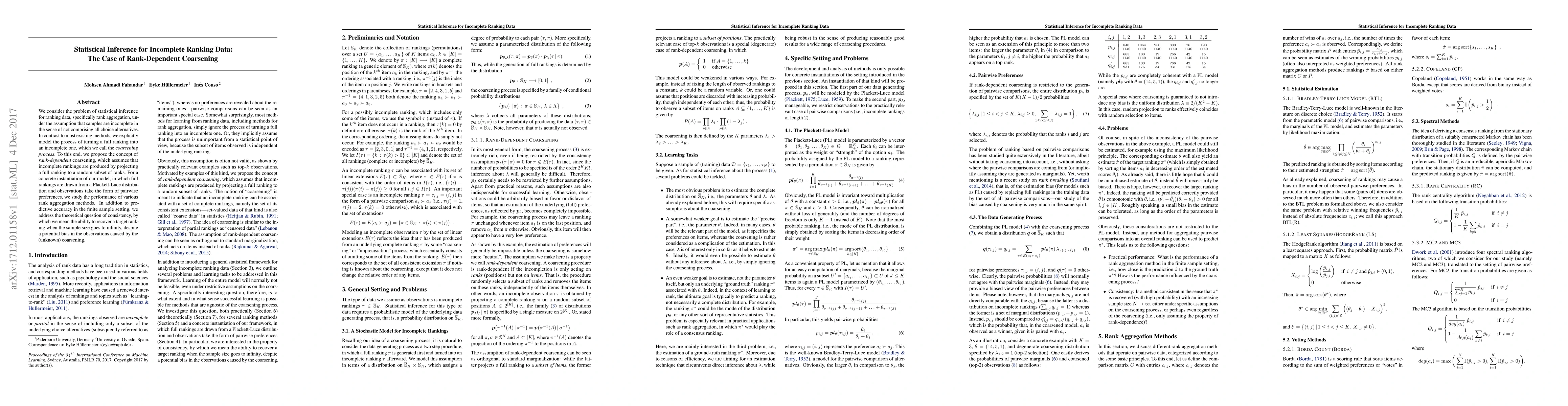 We consider the problem of statistical inference for ranking data, specifically rank aggregation, under the assumption that samples are incomplete in the sense of not comprising all choice alternatives. In contrast to most existing methods, we explicitly model the process of turning a full ranking into an incomplete one, which we call the coarsening process. To this end, we propose the concept of rank-dependent coarsening, which assumes that incomplete rankings are produced by projecting a full ranking to a random subset of ranks. For a concrete instantiation of our model, in which full rankings are drawn from a Plackett-Luce distribution and observations take the form of pairwise preferences, we study the performance of various rank aggregation methods. In addition to predictive accuracy in the finite sample setting, we address the theoretical question of consistency, by which we mean the ability to recover a target ranking when the sample size goes to infinity, despite a potential bias in the observations caused by the (unknown) coarsening.