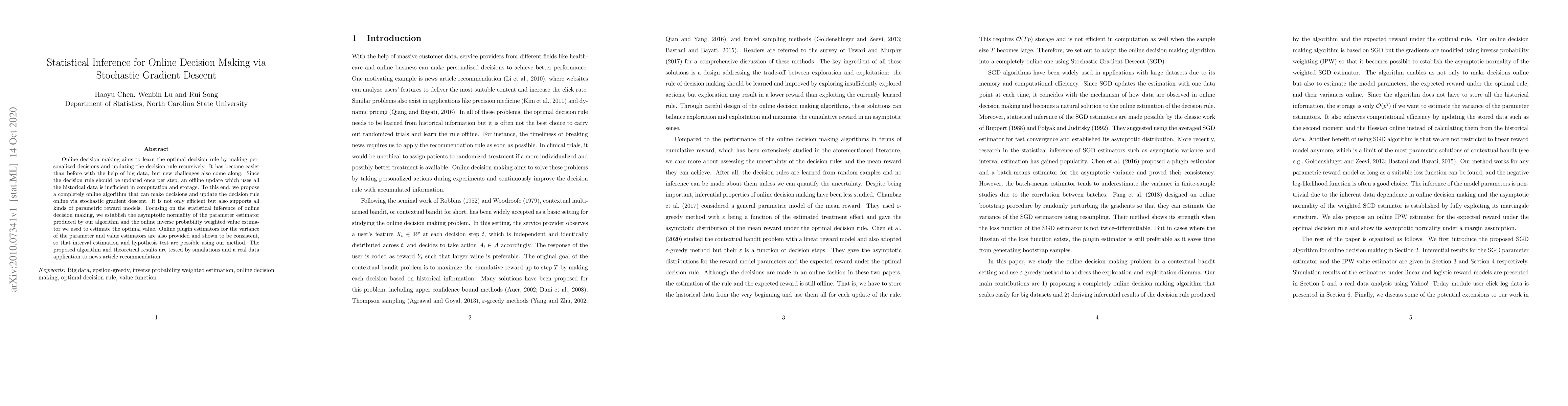 This paper proposes an online algorithm using stochastic gradient descent for efficient decision making, establishing the asymptotic normality of parameter and value estimators. Simulations and a real-world application to news article recommendation demonstrate its effectiveness.