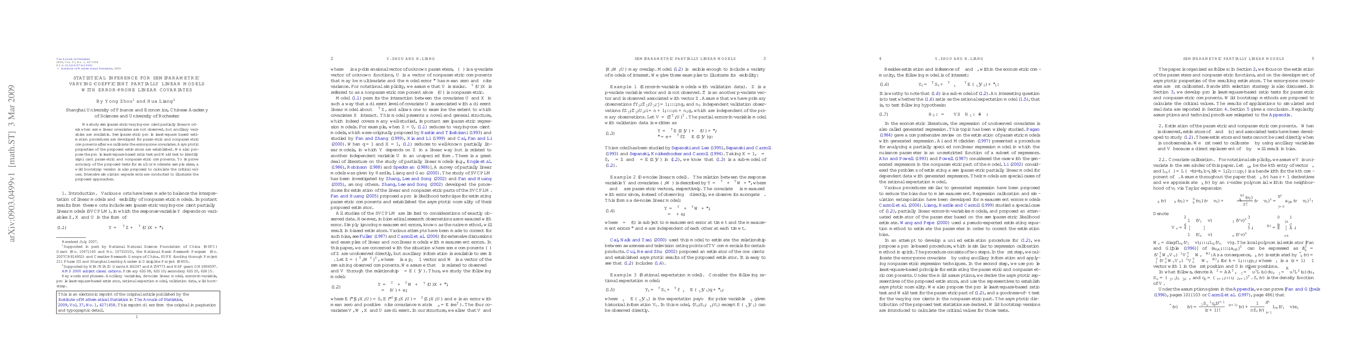 This paper develops semiparametric profile least-squares estimators for varying-coefficient partially linear models with error-prone linear covariates, using ancillary variables for calibration. It proposes profile least-squares ratio and Wald tests for identifying significant components and uses a wild bootstrap method for small sample sizes.