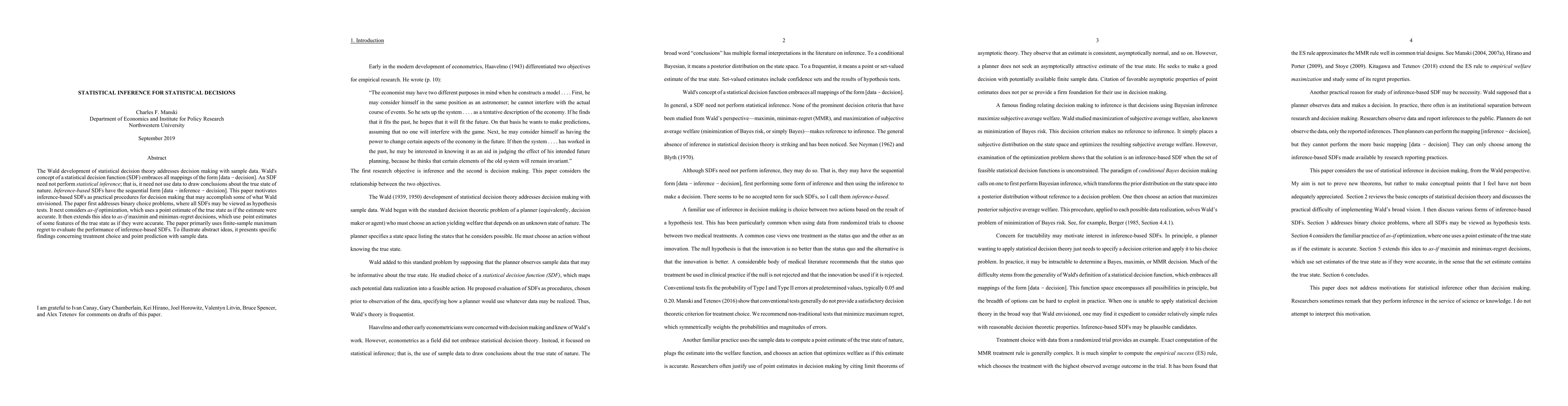 The paper contributes to statistical decision theory by motivating inference-based SDFs and extending the concept of as-if decision-making to include as-if maximin and minimax-regret decisions.
