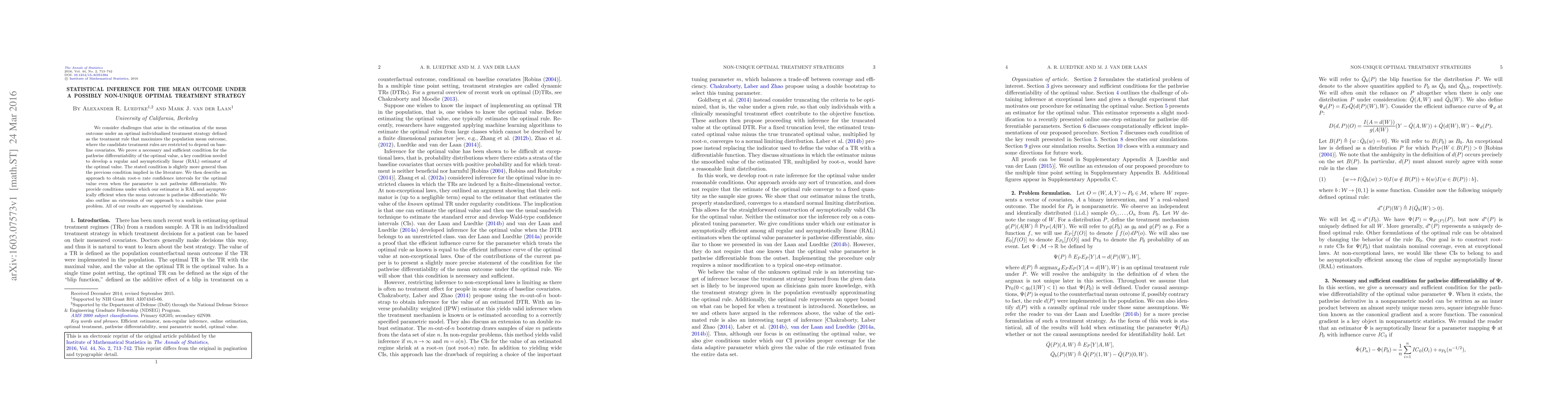 We consider challenges that arise in the estimation of the mean outcome under an optimal individualized treatment strategy defined as the treatment rule that maximizes the population mean outcome, where the candidate treatment rules are restricted to depend on baseline covariates. We prove a necessary and sufficient condition for the pathwise differentiability of the optimal value, a key condition needed to develop a regular and asymptotically linear (RAL) estimator of the optimal value. The stated condition is slightly more general than the previous condition implied in the literature. We then describe an approach to obtain root-$n$ rate confidence intervals for the optimal value even when the parameter is not pathwise differentiable. We provide conditions under which our estimator is RAL and asymptotically efficient when the mean outcome is pathwise differentiable. We also outline an extension of our approach to a multiple time point problem. All of our results are supported by simulations.
