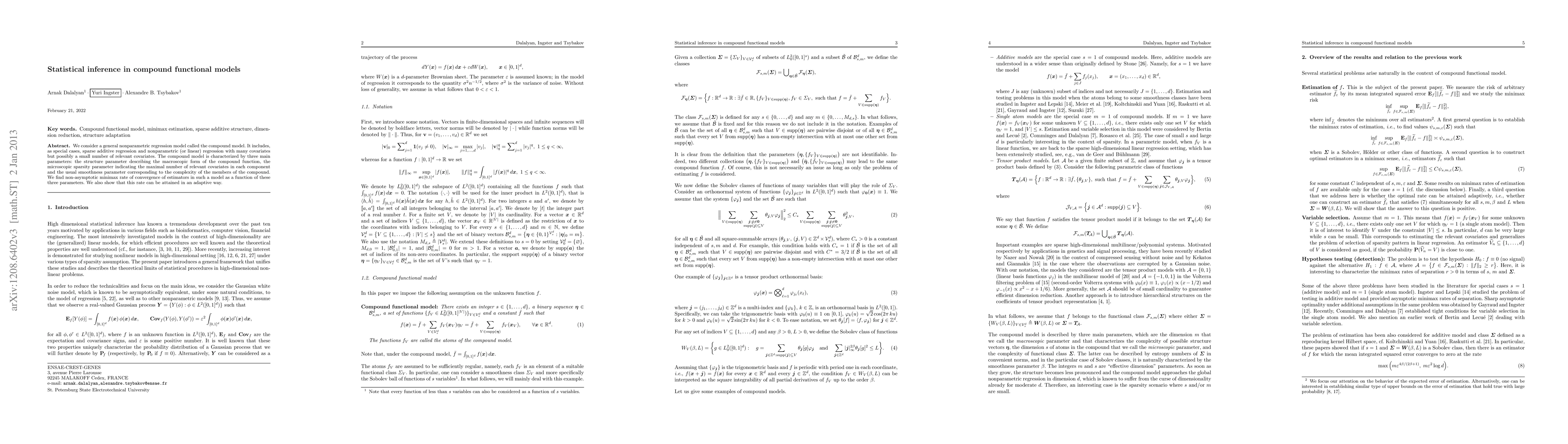 We consider a general nonparametric regression model called the compound model. It includes, as special cases, sparse additive regression and nonparametric (or linear) regression with many covariates but possibly a small number of relevant covariates. The compound model is characterized by three main parameters: the structure parameter describing the "macroscopic" form of the compound function, the "microscopic" sparsity parameter indicating the maximal number of relevant covariates in each component and the usual smoothness parameter corresponding to the complexity of the members of the compound. We find non-asymptotic minimax rate of convergence of estimators in such a model as a function of these three parameters. We also show that this rate can be attained in an adaptive way.