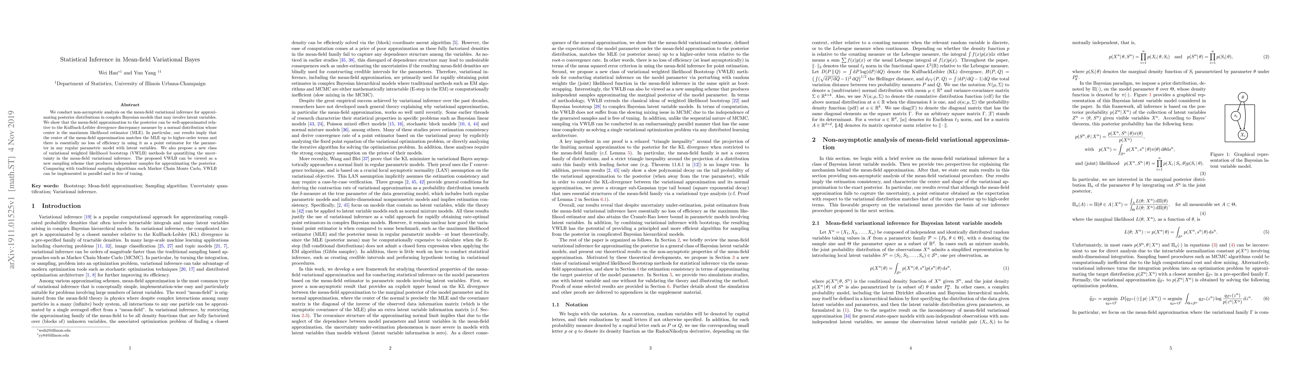 This paper analyzes mean-field variational inference in Bayesian models with latent variables, demonstrating that the mean-field approximation closely matches the maximum likelihood estimator. The authors introduce a new variational weighted likelihood bootstrap method for quantifying uncertainty, which offers parallel implementation and avoids tuning.