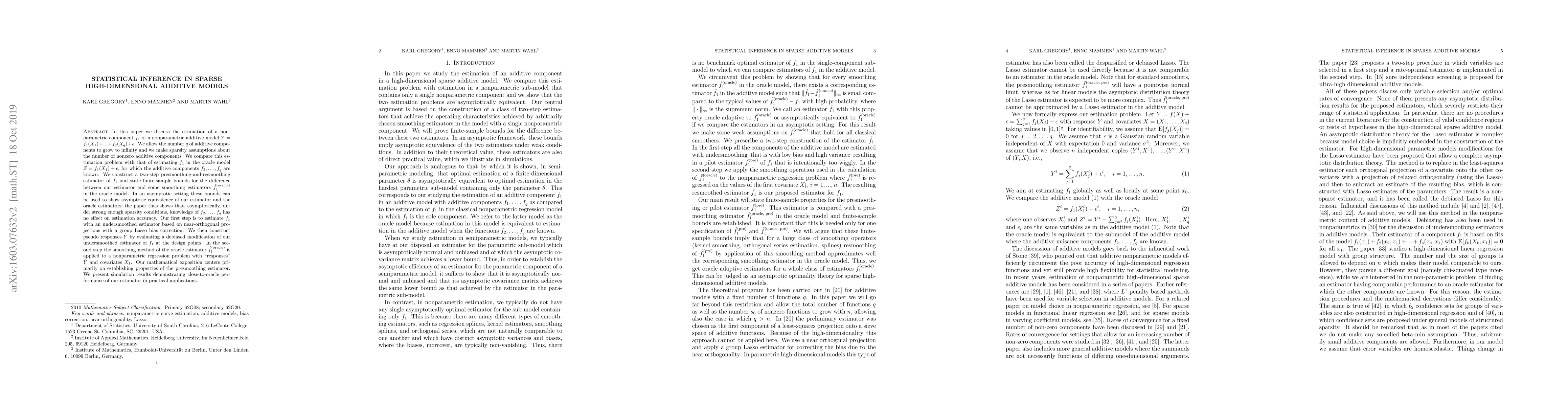 In this paper we discuss the estimation of a nonparametric component $f_1$ of a nonparametric additive model $Y=f_1(X_1) + ...+ f_q(X_q) + \epsilon$. We allow the number $q$ of additive components to grow to infinity and we make sparsity assumptions about the number of nonzero additive components. We compare this estimation problem with that of estimating $f_1$ in the oracle model $Z= f_1(X_1) + \epsilon$, for which the additive components $f_2,\dots,f_q$ are known. We construct a two-step presmoothing-and-resmoothing estimator of $f_1$ and state finite-sample bounds for the difference between our estimator and some smoothing estimators $\hat f_1^{\text{(oracle)}}$ in the oracle model. In an asymptotic setting these bounds can be used to show asymptotic equivalence of our estimator and the oracle estimators; the paper thus shows that, asymptotically, under strong enough sparsity conditions, knowledge of $f_2,\dots,f_q$ has no effect on estimation accuracy. Our first step is to estimate $f_1$ with an undersmoothed estimator based on near-orthogonal projections with a group Lasso bias correction. We then construct pseudo responses $\hat Y$ by evaluating a debiased modification of our undersmoothed estimator of $f_1$ at the design points. In the second step the smoothing method of the oracle estimator $\hat f_1^{\text{(oracle)}}$ is applied to a nonparametric regression problem with responses $\hat Y$ and covariates $X_1$. Our mathematical exposition centers primarily on establishing properties of the presmoothing estimator. We present simulation results demonstrating close-to-oracle performance of our estimator in practical applications.