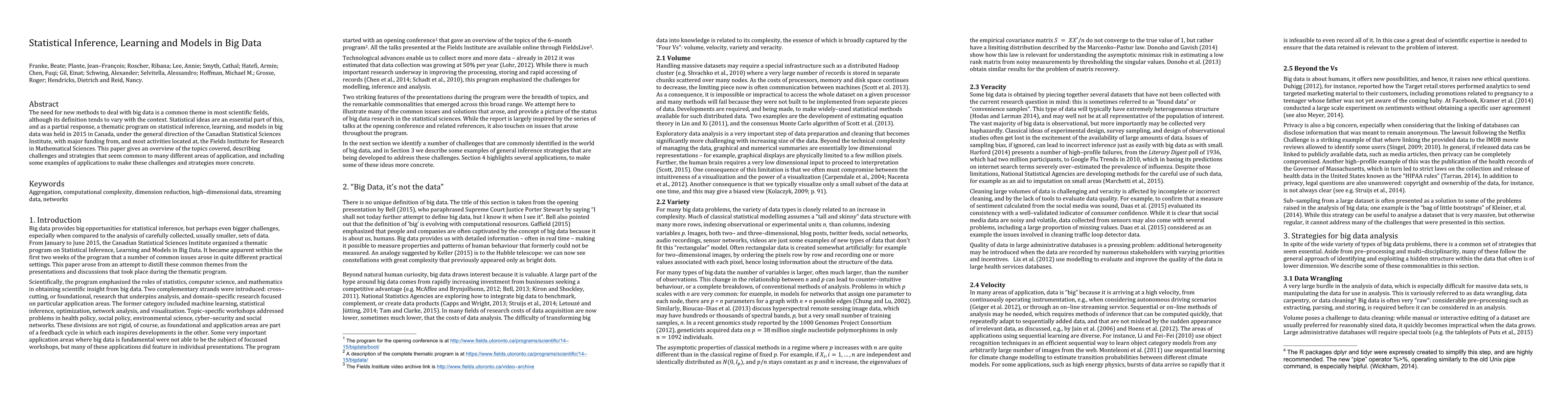 The need for new methods to deal with big data is a common theme in most scientific fields, although its definition tends to vary with the context. Statistical ideas are an essential part of this, and as a partial response, a thematic program on statistical inference, learning, and models in big data was held in 2015 in Canada, under the general direction of the Canadian Statistical Sciences Institute, with major funding from, and most activities located at, the Fields Institute for Research in Mathematical Sciences. This paper gives an overview of the topics covered, describing challenges and strategies that seem common to many different areas of application, and including some examples of applications to make these challenges and strategies more concrete.