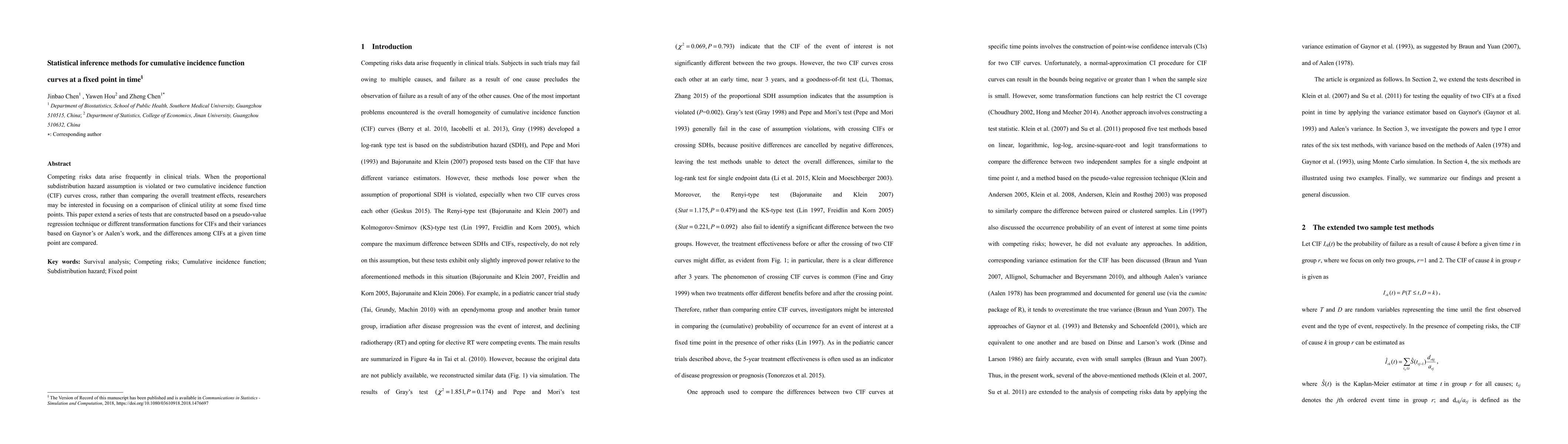 Researchers developed new statistical methods to compare cumulative incidence function curves at a fixed point in time for competing risks data, allowing for the evaluation of clinical utility without assuming proportional subdistribution hazards.