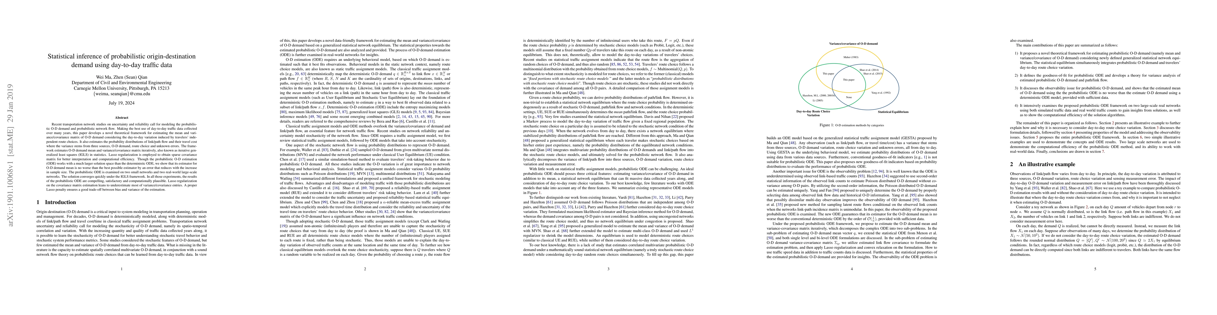 This paper develops a novel statistical framework for estimating probabilistic origin-destination demand using day-to-day traffic data, leveraging iterative generalized least squares and Lasso regularization to handle variance from O-D demand, route choice, and errors. The probabilistic approach shows comparable accuracy to deterministic methods, with satisfactory results across various network sizes.