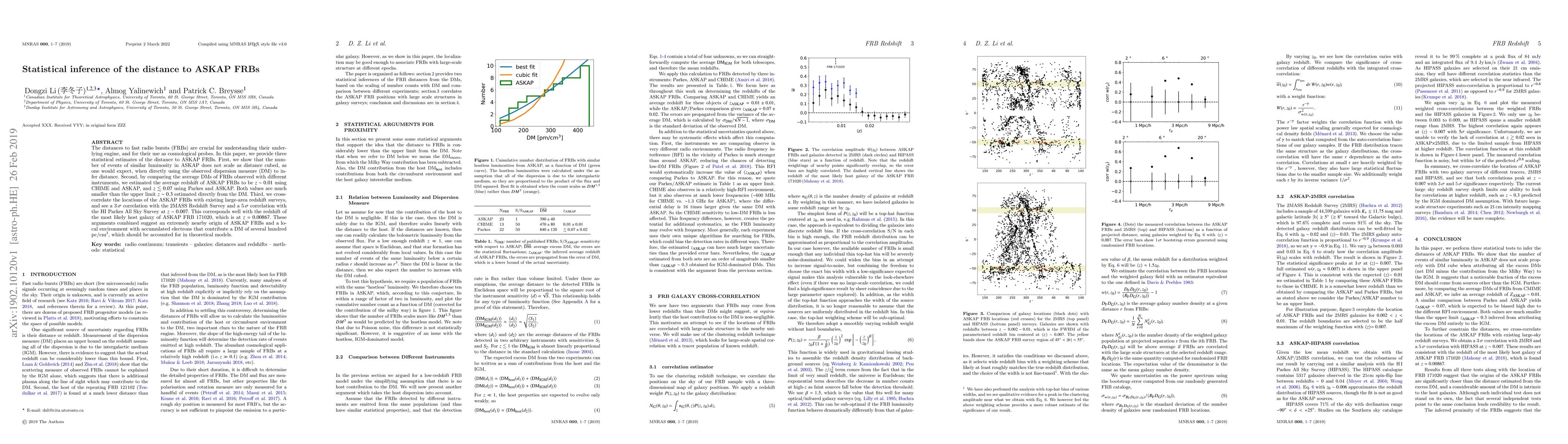 This research presents three statistical estimates for the distance to Australian Square Kilometre Array Pathfinder (ASKAP) fast radio bursts (FRBs). It finds that the number of FRBs doesn't decrease with distance cubed as expected from dispersion measure (DM) alone, suggesting nearby origins. Comparing average DMs from different telescopes estimates ASKAP FRB redshifts at z~0.01, lower than direct DM-based estimates. Cross-correlation with redshift surveys points to a correlation with z~0.007, supporting an extremely nearby origin for ASKAP FRBs. The findings imply a local environment with high electron density contributing to DM, which should be factored into theoretical models.