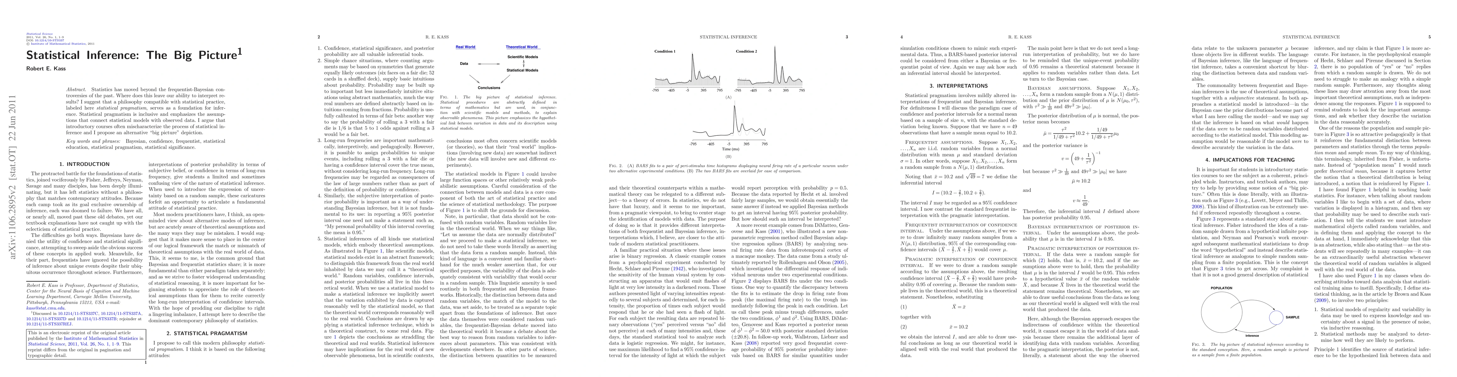 This paper proposes statistical pragmatism as a unifying philosophy for statistical inference, emphasizing the importance of assumptions linking models to data. It critiques traditional introductory courses for misrepresenting statistical inference and suggests a new "big picture" approach.