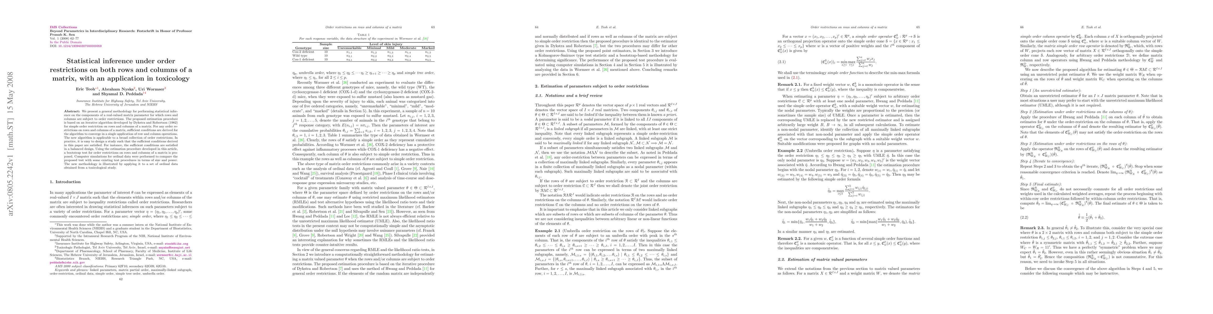 We present a general methodology for performing statistical inference on the components of a real-valued matrix parameter for which rows and columns are subject to order restrictions. The proposed estimation procedure is based on an iterative algorithm developed by Dykstra and Robertson (1982) for simple order restriction on rows and columns of a matrix. For any order restrictions on rows and columns of a matrix, sufficient conditions are derived for the algorithm to converge in a single application of row and column operations. The new algorithm is applicable to a broad collection of order restrictions. In practice, it is easy to design a study such that the sufficient conditions derived in this paper are satisfied. For instance, the sufficient conditions are satisfied in a balanced design. Using the estimation procedure developed in this article, a bootstrap test for order restrictions on rows and columns of a matrix is proposed. Computer simulations for ordinal data were performed to compare the proposed test with some existing test procedures in terms of size and power. The new methodology is illustrated by applying it to a set of ordinal data obtained from a toxicological study.