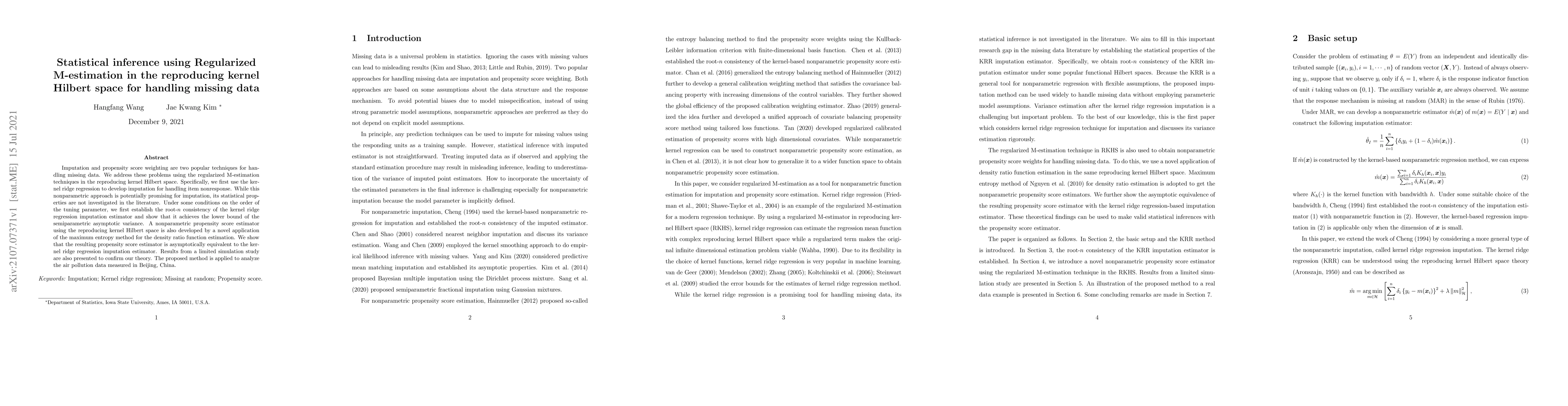 This paper uses regularized M-estimation in the reproducing kernel Hilbert space to address missing data through imputation and propensity score weighting. It establishes the root-$n$ consistency of kernel ridge regression for imputation and develops a nonparametric propensity score estimator, demonstrating their asymptotic equivalence.