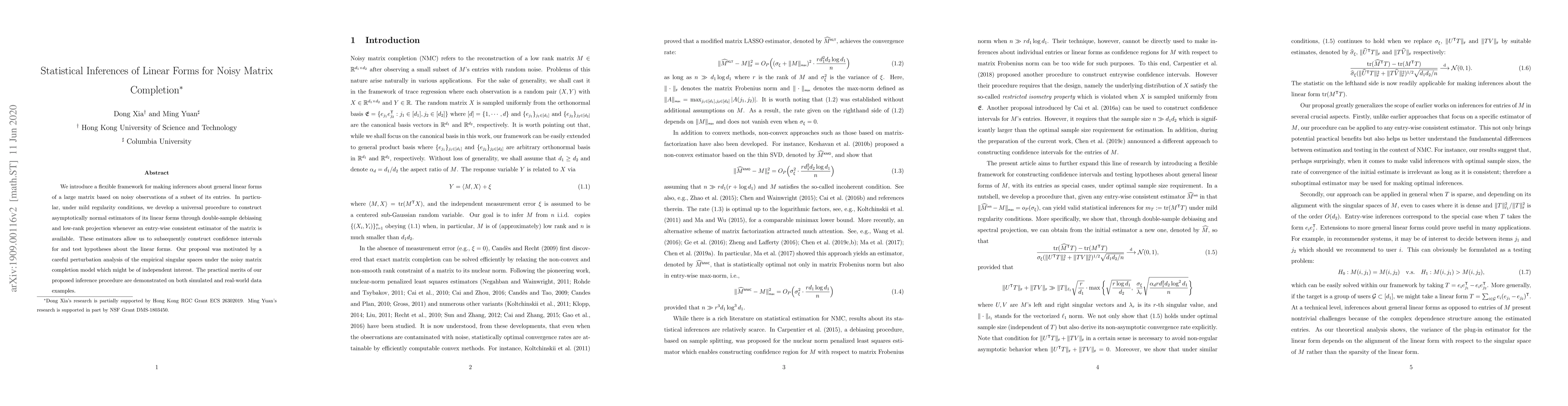 This paper presents a framework for inferring linear forms of a large matrix from noisy observations using double-sample debiasing and low-rank projection. The method constructs asymptotically normal estimators and allows for hypothesis testing and confidence interval construction, validated through simulations and real-world data.