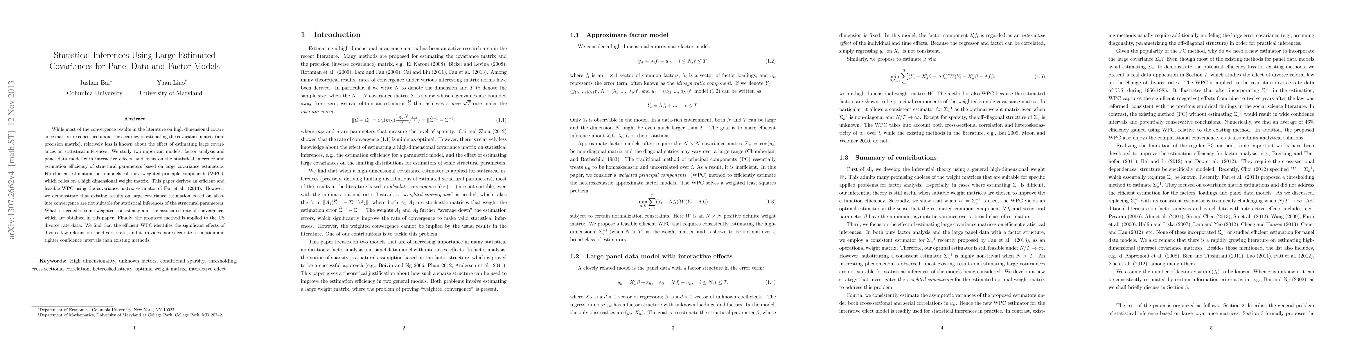 This paper investigates the impact of estimating large covariance matrices on statistical inferences in factor analysis and panel data models. It proposes an efficient weighted principle components method based on a high-dimensional weight matrix, demonstrating improved accuracy and tighter confidence intervals for structural parameter estimates compared to existing methods, as shown through an application to US divorce rate data.