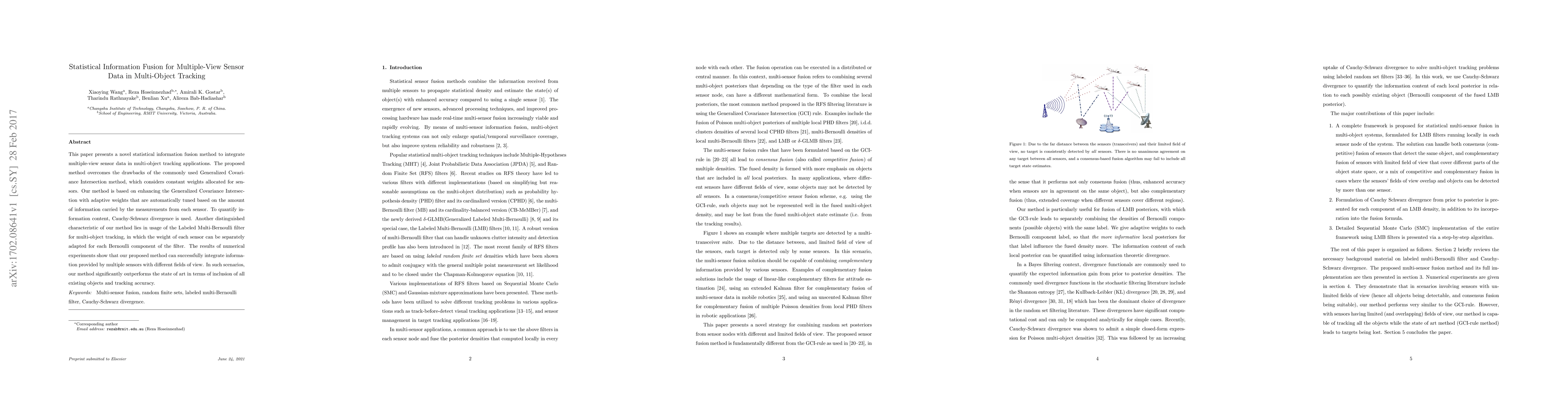 This paper introduces a statistical information fusion method that enhances multi-object tracking by integrating multiple-view sensor data with adaptive weights, outperforming traditional methods. The method uses Cauchy-Schwarz divergence to quantify information content and Labeled Multi-Bernoulli filter for tracking, achieving superior performance in tracking accuracy and object inclusion.