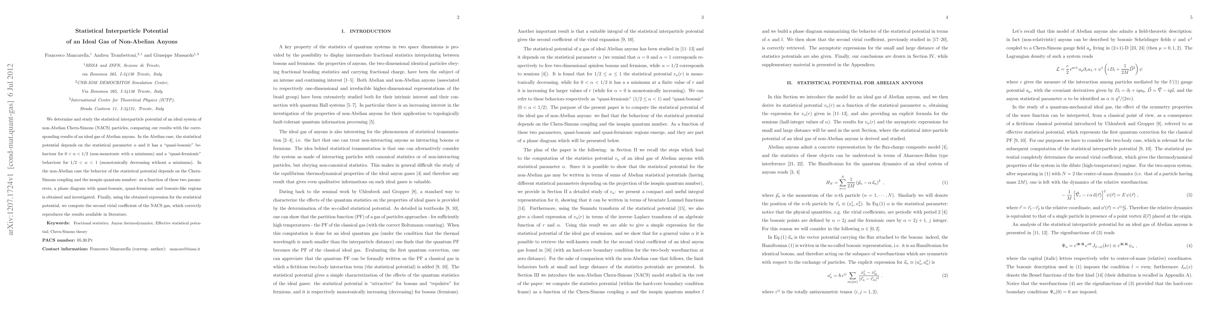 This research derives and analyzes the statistical interparticle potential for an ideal gas of non-Abelian Chern-Simons particles, contrasting it with Abelian anyons. It uncovers a phase diagram with quasi-bosonic, quasi-fermionic, and bosonic-like regions based on Chern-Simons coupling and isospin, and validates the findings by accurately calculating the second virial coefficient.