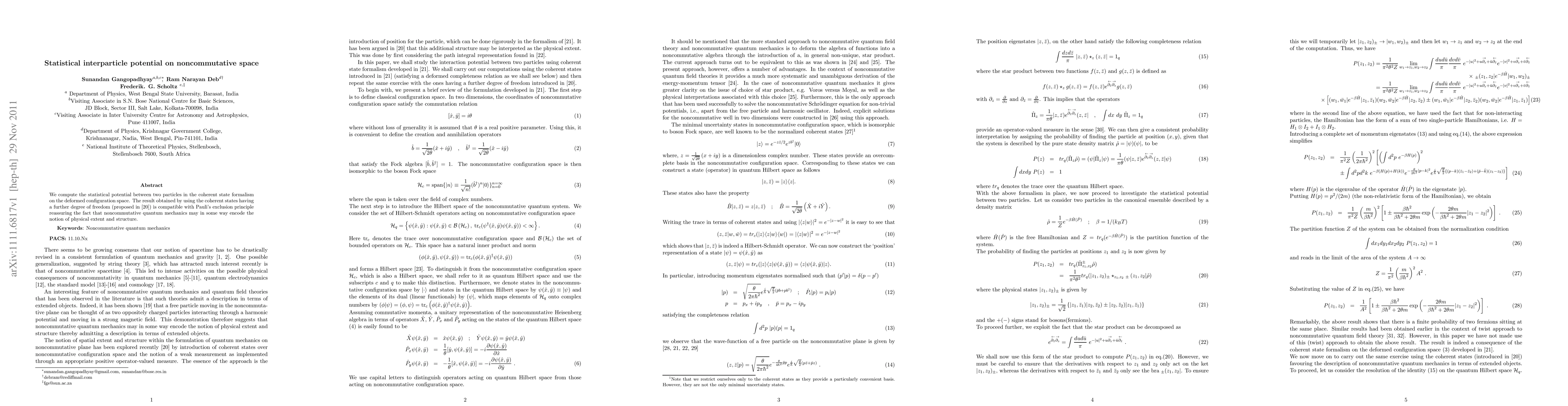 We compute the statistical potential between two particles in the coherent state formalism on the deformed configuration space. The result obtained by using the coherent states having a further degree of freedom (proposed in \cite{rohwer}) is compatible with Pauli's exclusion principle reassuring the fact that noncommutative quantum mechanics may in some way encode the notion of physical extent and structure.