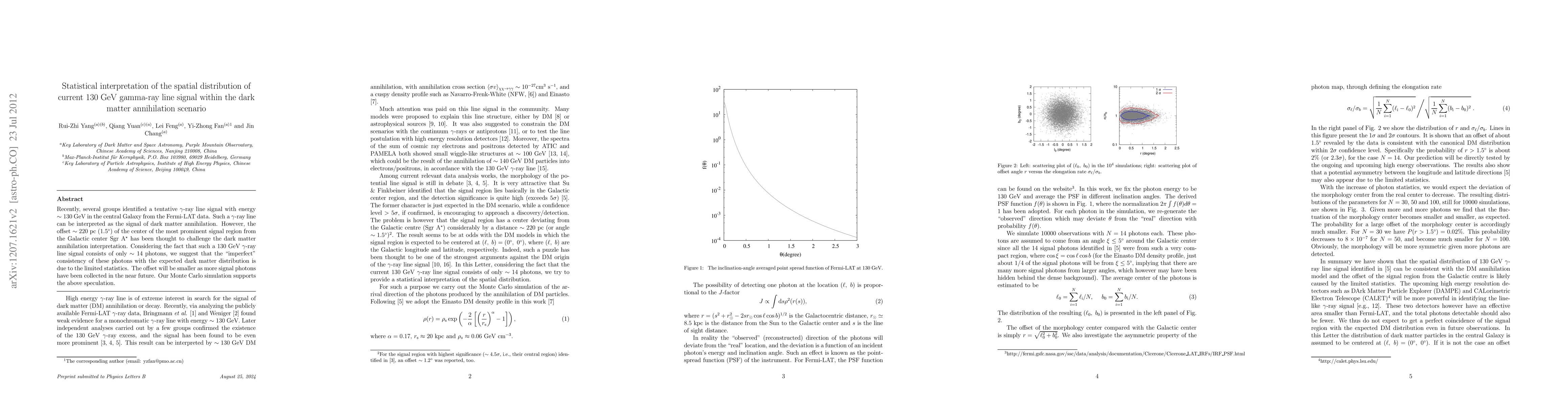 Recently, several groups identified a tentative $\gamma$-ray line signal with energy $\sim 130$ GeV in the central Galaxy from the Fermi-LAT data. %The morphology study shows that the signal is consistent with dark matter %annihilation, but with an offset $\sim 220$ pc ($1.5^{\circ}$) of the %center from the Galactic center Sgr A$^{\star}$, Such a $\gamma-$ray line can be interpreted as the signal of dark matter annihilation. However, the offset $\sim 220$ pc ($1.5^{\circ}$) of the center of the most prominent signal region from the Galactic center Sgr A$^{\star}$ has been thought to challenge the dark matter annihilation interpretation. Considering the fact that such a 130 GeV $\gamma$-ray line signal consists of only $\sim14$ photons, we suggest that the "imperfect" consistency of these photons with the expected dark matter distribution is due to the limited statistics. The offset will be smaller as more signal photons have been collected in the near future. Our Monte Carlo simulation supports the above speculation.