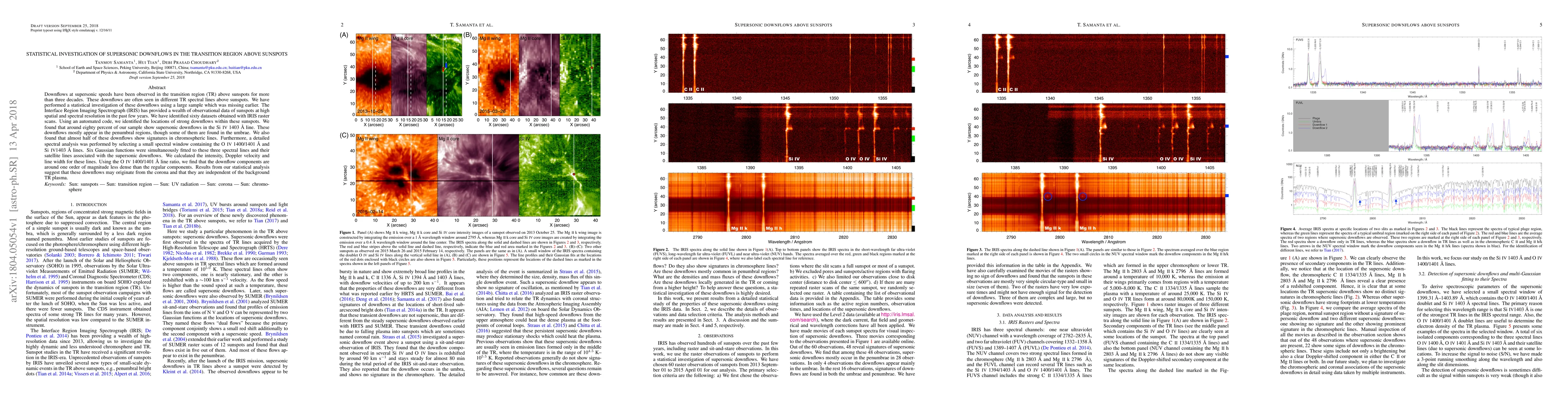 This study statistically investigates supersonic downflows in the transition region above sunspots using IRIS data, identifying strong downflows in 80% of the sample, primarily in penumbral regions. The analysis reveals that these downflows are less dense than regular transition region plasma and likely originate from the corona, independent of background plasma.