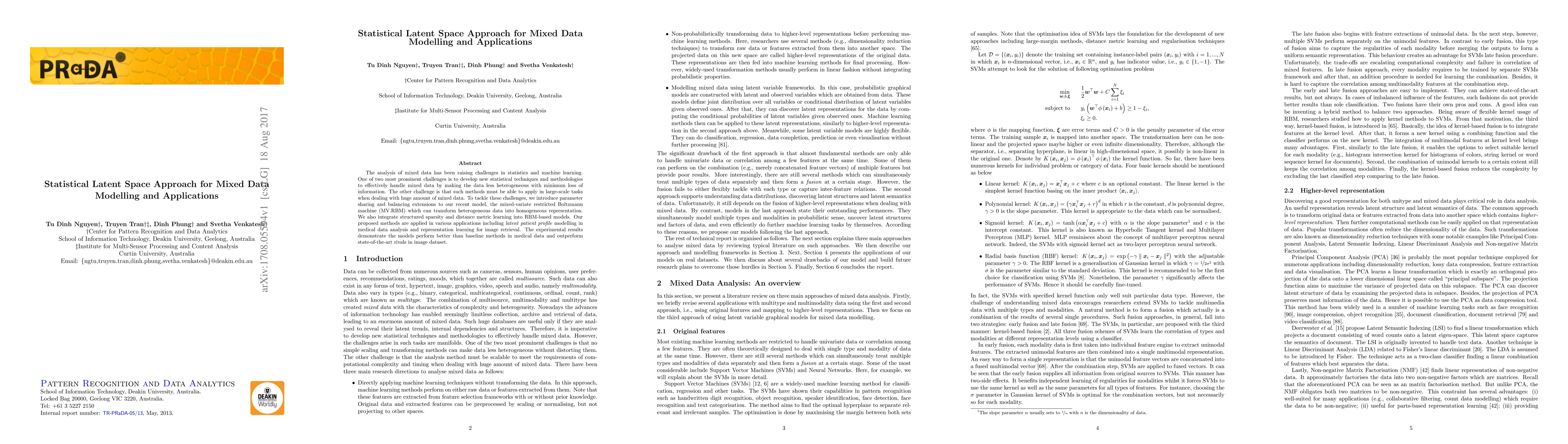 The analysis of mixed data has been raising challenges in statistics and machine learning. One of two most prominent challenges is to develop new statistical techniques and methodologies to effectively handle mixed data by making the data less heterogeneous with minimum loss of information. The other challenge is that such methods must be able to apply in large-scale tasks when dealing with huge amount of mixed data. To tackle these challenges, we introduce parameter sharing and balancing extensions to our recent model, the mixed-variate restricted Boltzmann machine (MV.RBM) which can transform heterogeneous data into homogeneous representation. We also integrate structured sparsity and distance metric learning into RBM-based models. Our proposed methods are applied in various applications including latent patient profile modelling in medical data analysis and representation learning for image retrieval. The experimental results demonstrate the models perform better than baseline methods in medical data and outperform state-of-the-art rivals in image dataset.