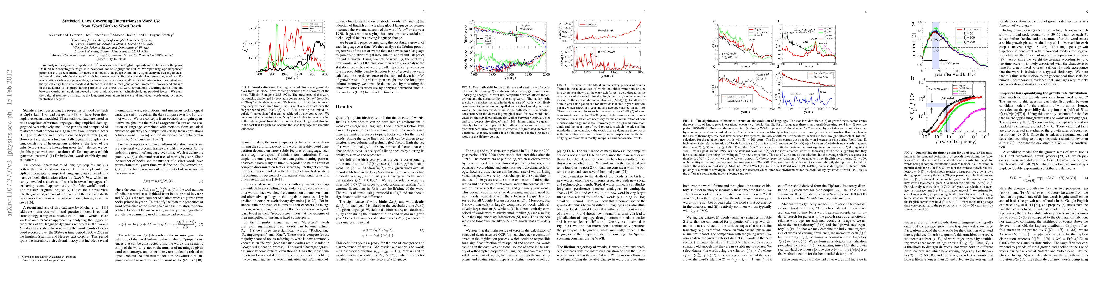 This paper investigates the statistical laws governing word use evolution from birth to death across English, Spanish, and Hebrew languages, revealing language-independent patterns and shifts in word selection laws. It highlights the impact of social, technological, and political factors on language dynamics, particularly during wartime, and quantifies cultural memory through long-term correlations in word usage.