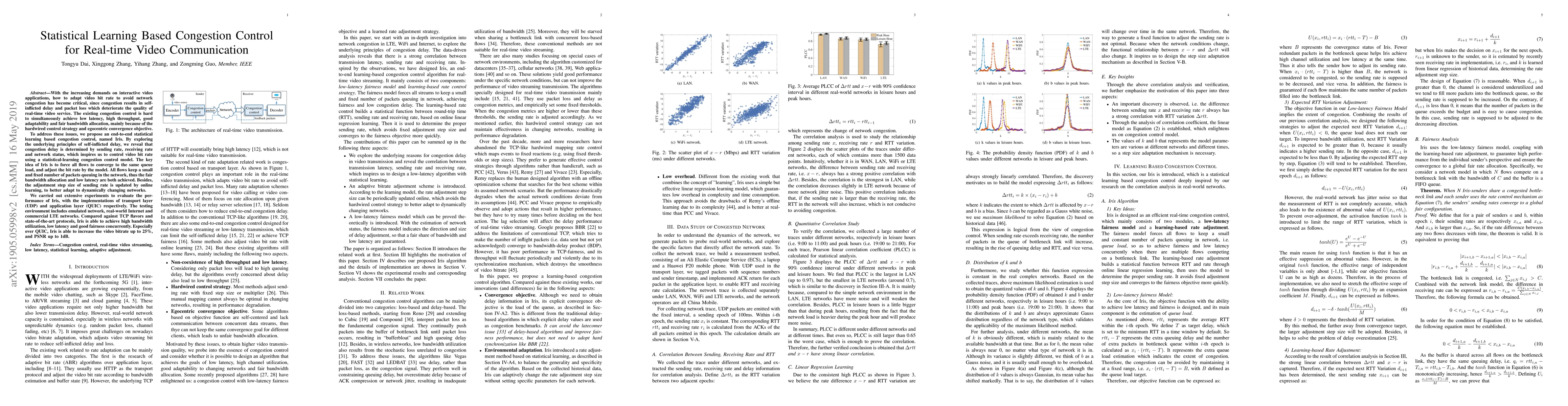 The paper proposes Iris, a statistical learning-based congestion control method for real-time video communication, aiming to achieve low latency, high throughput, and fair bandwidth allocation. Iris adjusts video bit rate based on a statistical model to maintain a balanced queue load across all flows, achieving better adaptability and performance over TCP and other protocols in various network environments.
